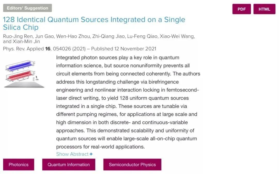 近日,上海交通大学金贤敏团队在实验上实现了单片集成128个全同量子光源的阵列芯片,这是目前有报道技术中能实现的最大规模的全同可扩展量子光源阵列,研究成果以「128 identical quantum sources integrated on a single silica chip」为题,发表在美国物理学权威应用期刊physical review applied上,并被遴选为「编辑推荐」(editors' suggestion)。