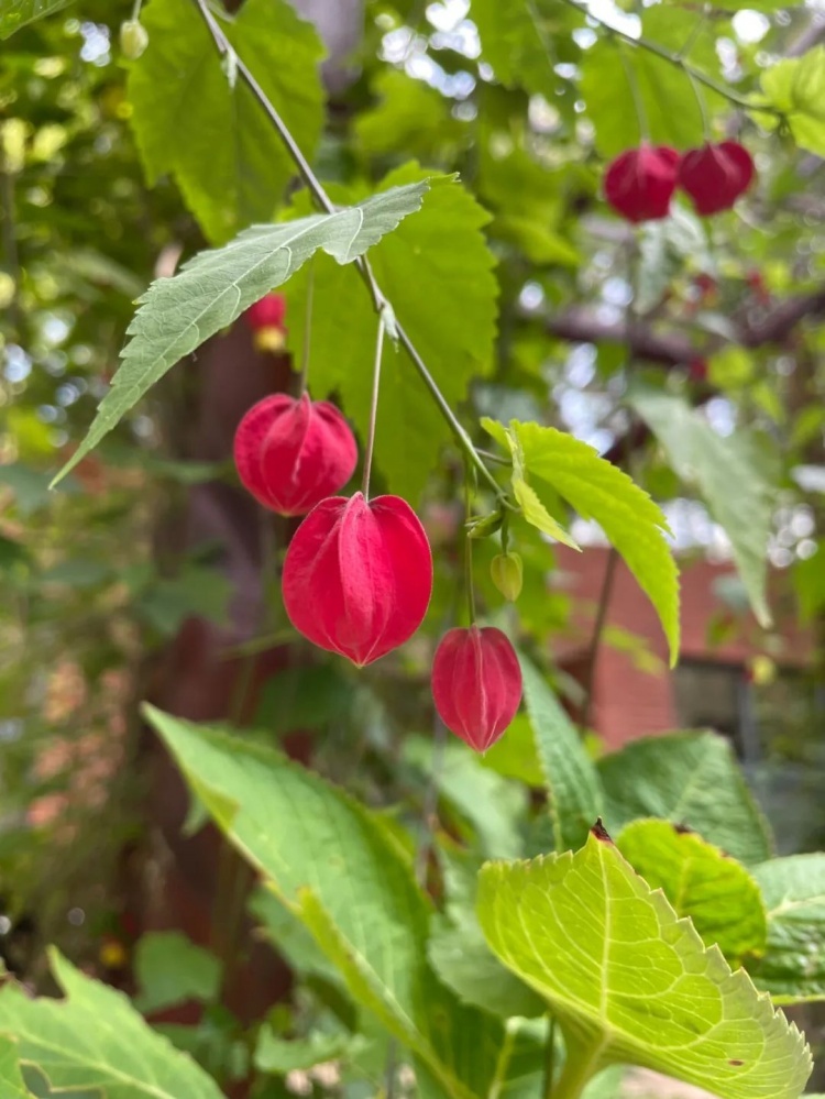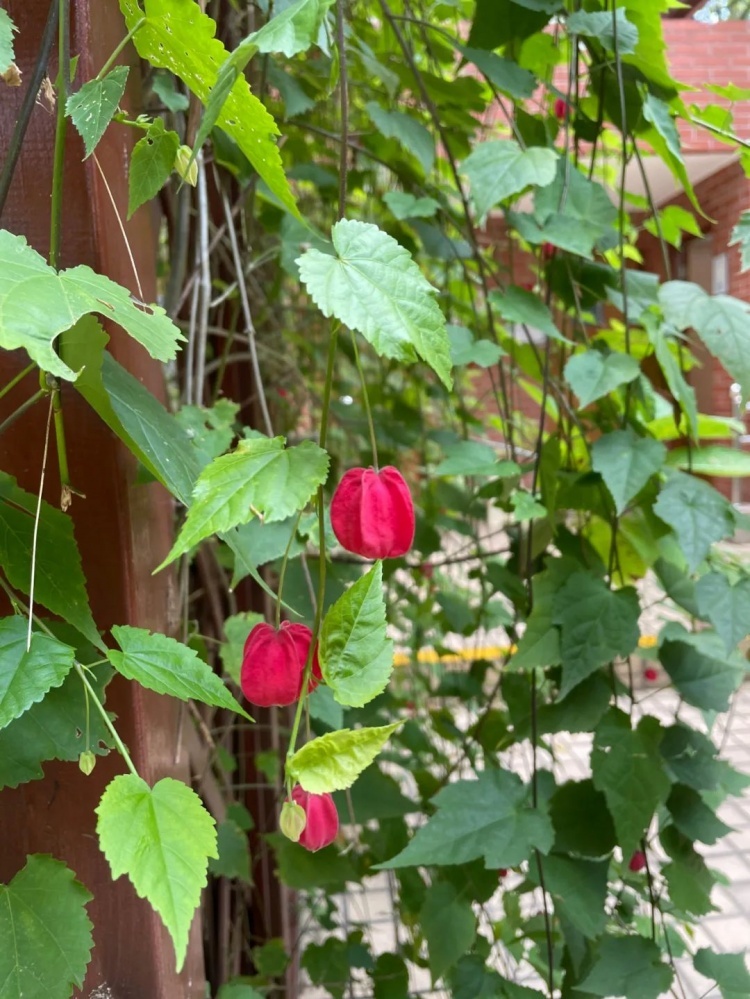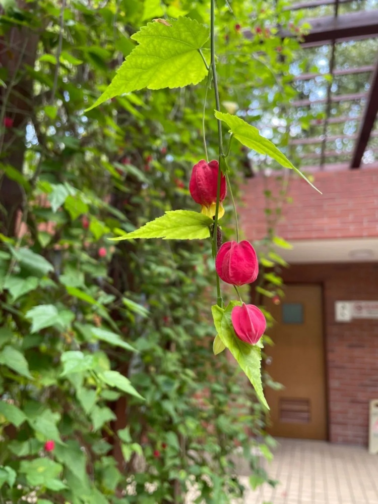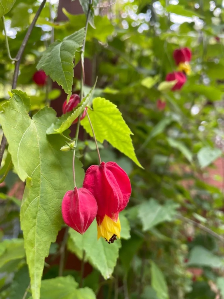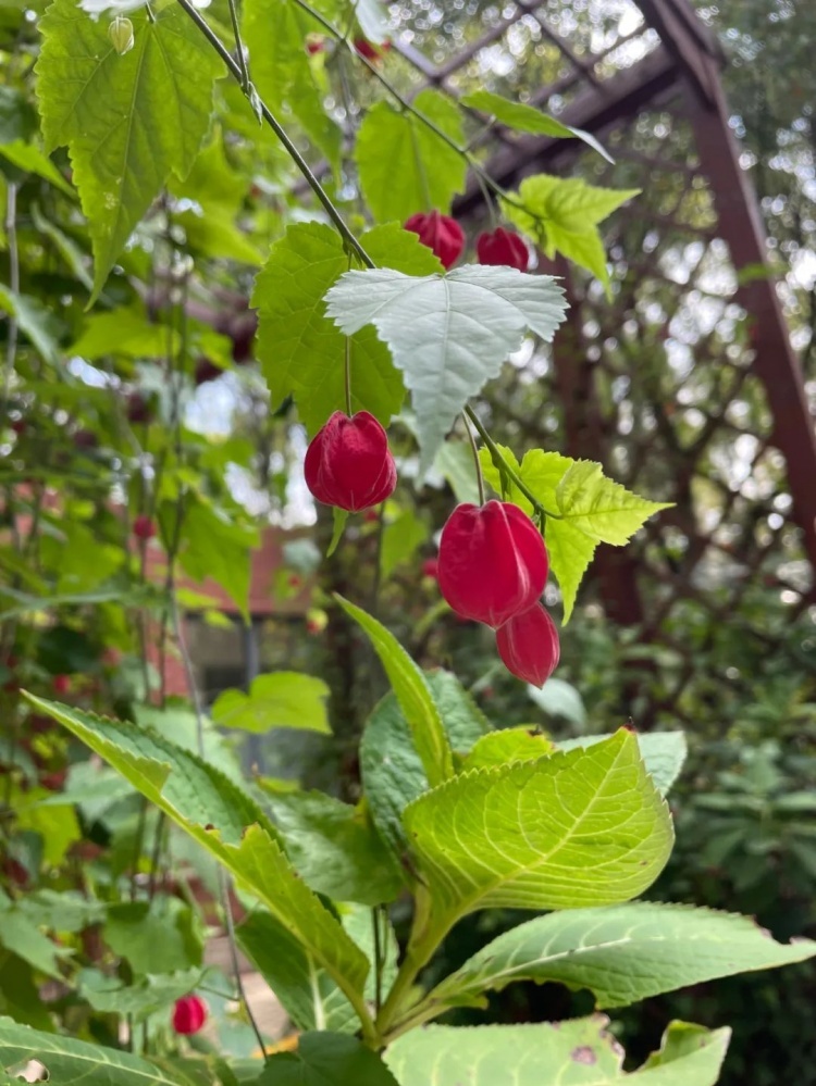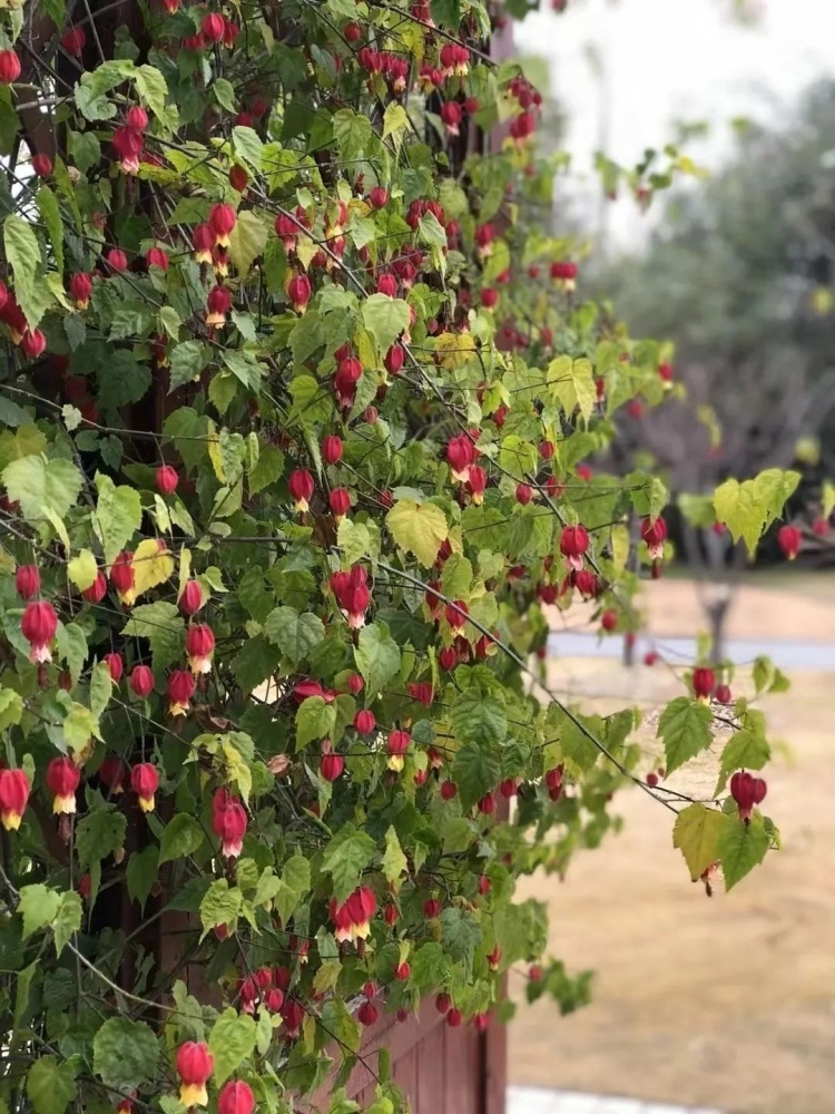 原产南美洲,是锦葵科苘麻属常绿软木质藤蔓状灌木。它的枝条纤细柔软,分枝多,种植时需要搭设藤架以作支撑;花梗细长,下垂,花萼红色,犹如颗颗红心;花瓣黄色,花蕊深棕色,颜色对比强烈,层次明显,极为美观。