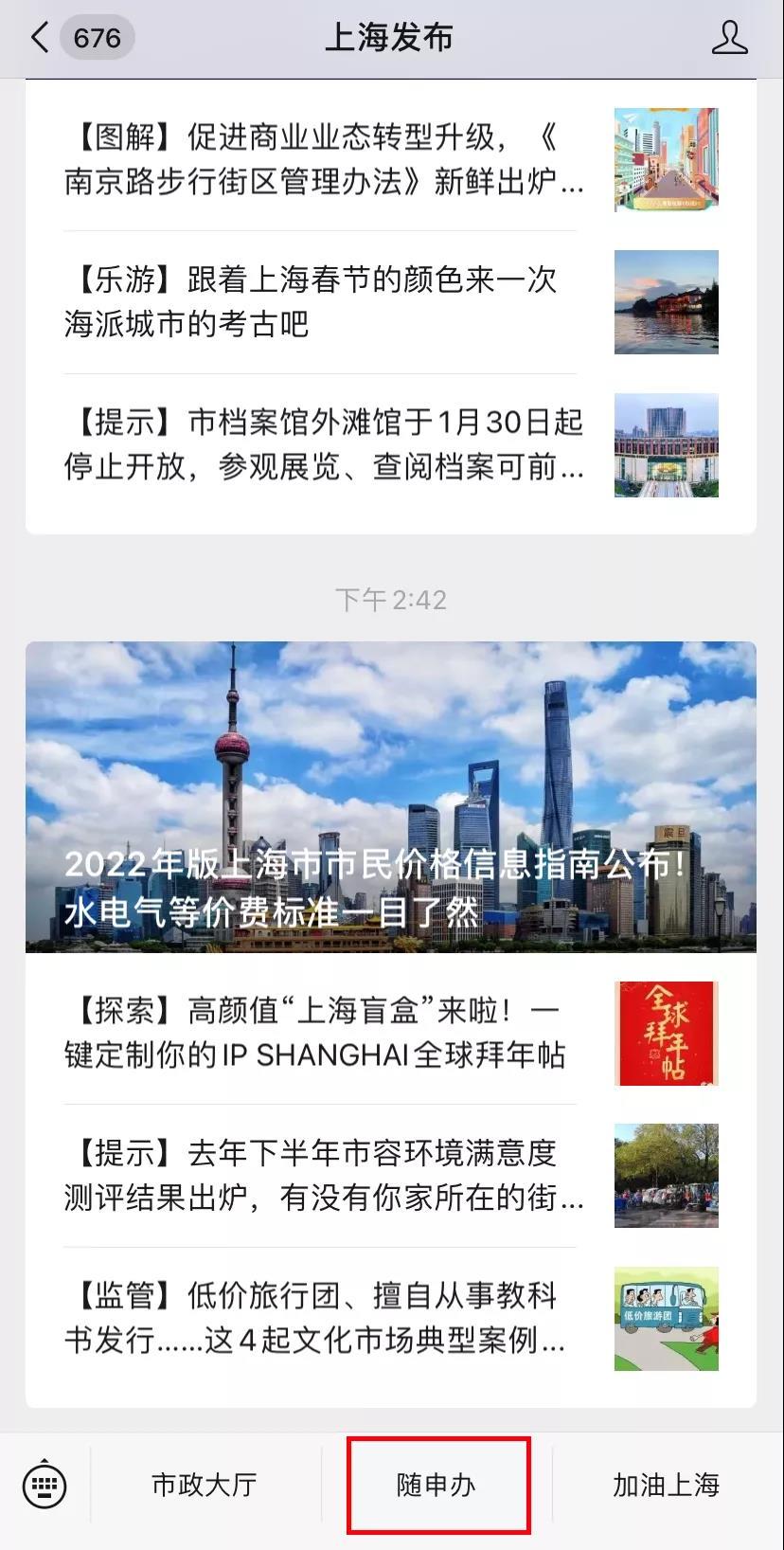 以“随申办”微信小程序为例。在“上海发布”微信公众号底部菜单栏进入“随申办”微信小程序。
