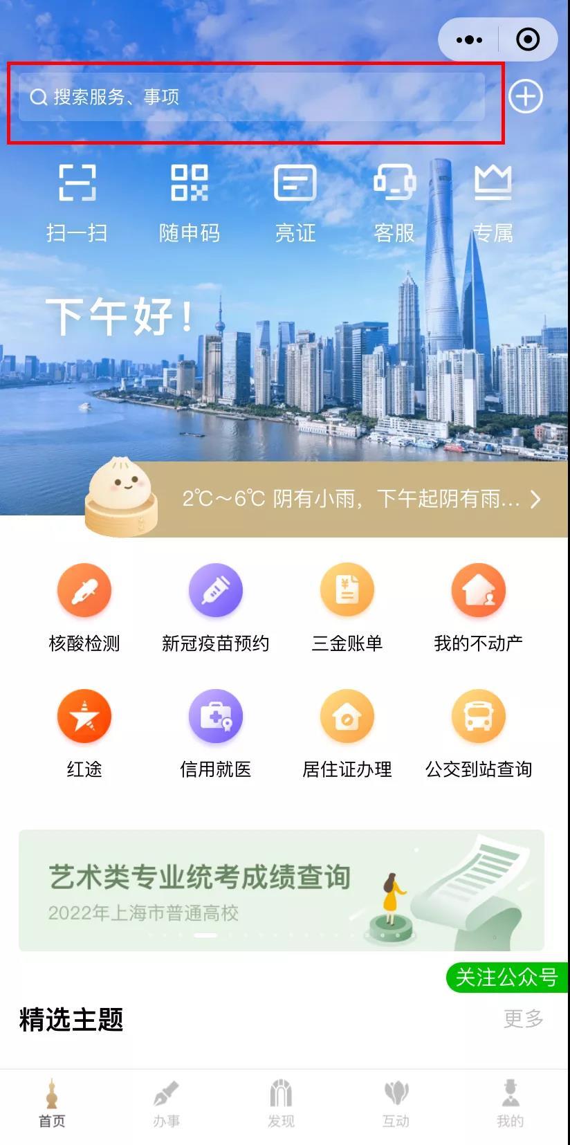 “随申办”app、“随申办”支付宝小程序首页点击搜索栏也可进入。