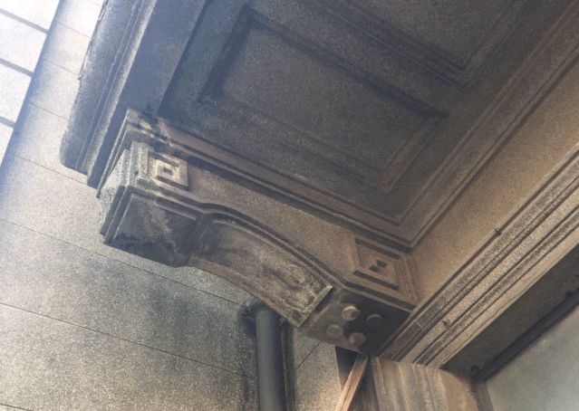 建筑外墙是20世纪初上海西式建筑常见的水刷石饰面,利用水泥抹灰中掺石子的手法模拟石材效果,是上海近现代建筑遗产中的一大特色工艺。建筑修缮前,立面水刷石污染严重,有些后期修补的部位或产生空鼓等安全问题,或由于后期修补材料、手法不当而造成立面变“花脸”。