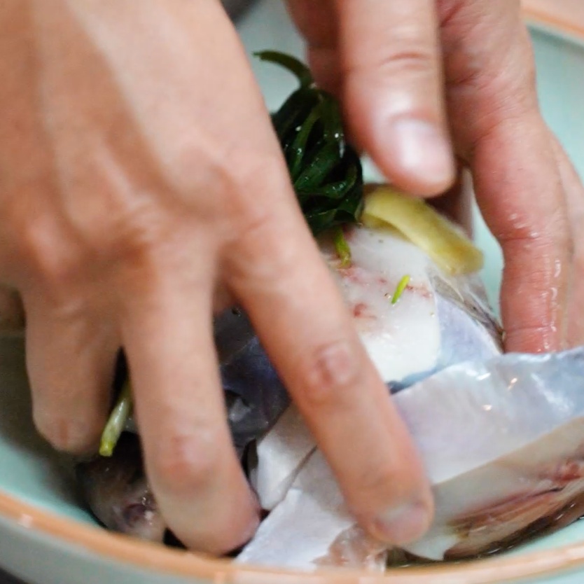 2. 准备一点葱姜汁,将鲳鱼进去,加盐腌制一会儿;