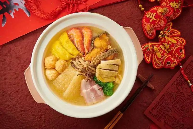 全家福砂锅,蛋饺、黄芽菜、咸肉、虾……食材丰富,热气腾腾,汤鲜菜美。在春节这样阖家团圆的日子,热热乎乎的全家福砂锅,暖胃又暖心。