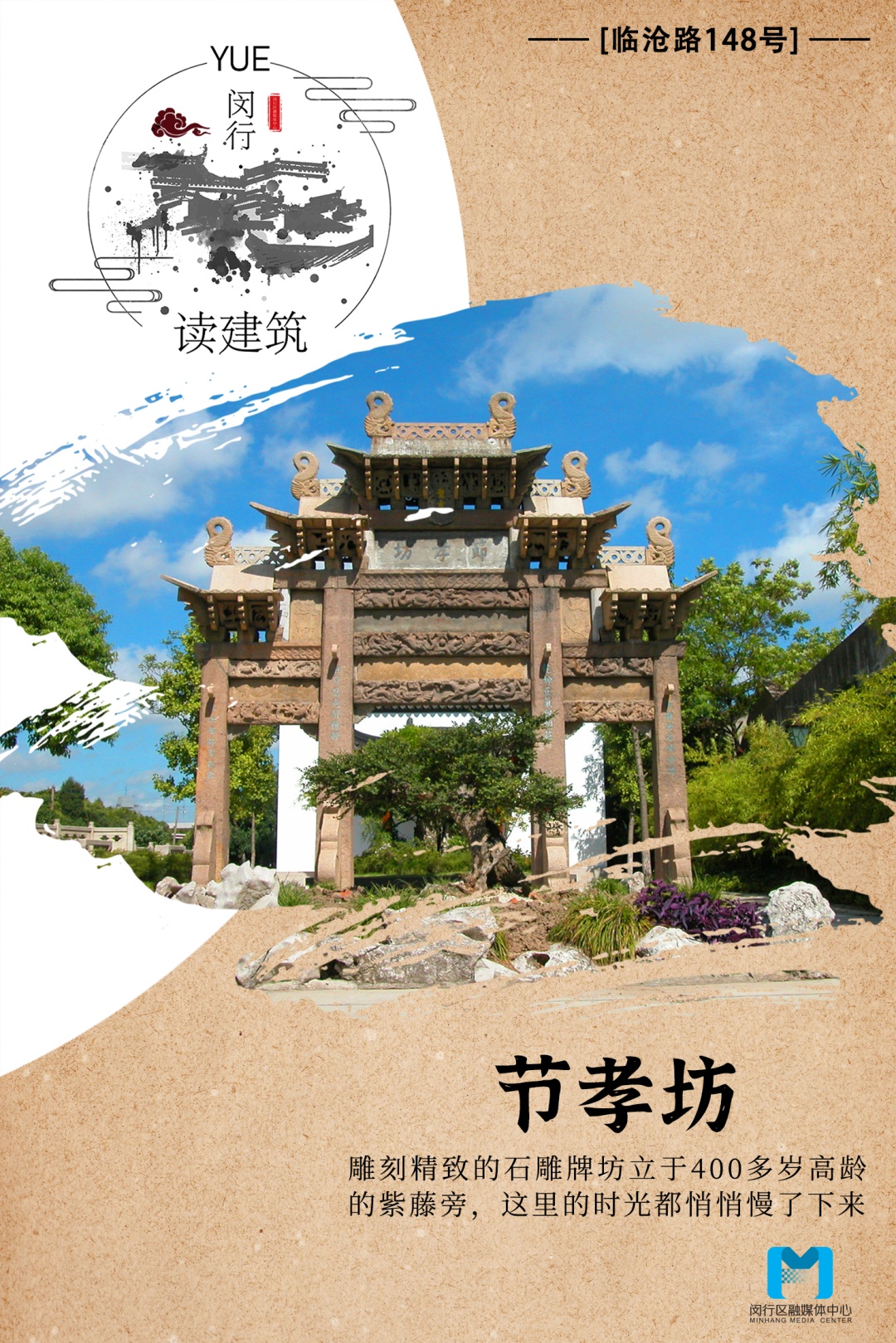 节孝坊,现位于江川路街道中西部的临沧路148号古藤园内西北隅。原位于闵行老街前东街15号,被砌建于房屋墙内,在闵行老街动迁拆房时面貌显露。节孝坊始建于清乾隆十二年(1747),1996年迁至现址,1997年对缺损部位作全面修复。1999年8月17日被公布为闵行区文物保护单位。