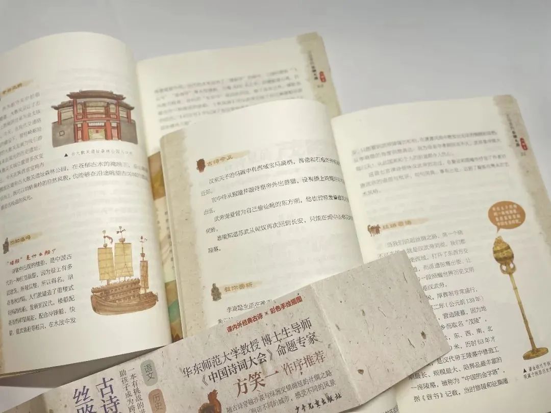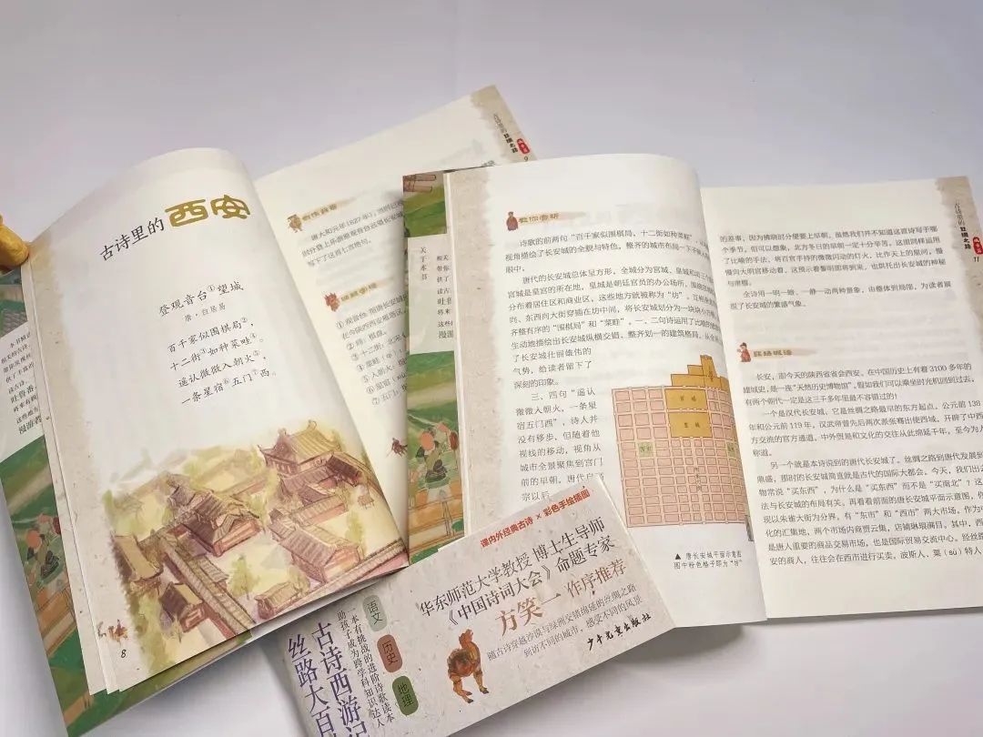 里面包含了课内外50首经典诗歌和100多幅彩色手绘插图。不仅有专业且丰富的诗歌解读,还从诗歌出发,探寻了丝路城市、风景的古今故事。