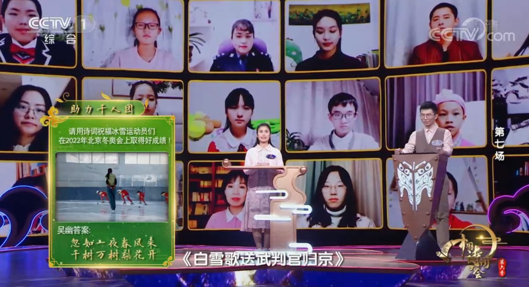 这是《中国诗词大会》第六季比赛中的一个环节,参赛选手们应中国首位冬奥会冠军杨扬的邀请,为运动员们送上了祝福。