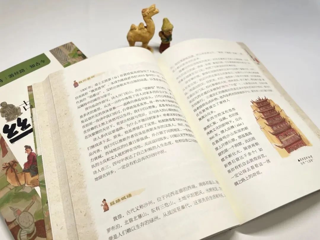 《古诗里的丝绸之路》分为“城市篇”与“风物篇”两册,是专业学者为少儿读者编写的人文读本。该书以陆上丝绸之路为线索,用50首诗歌,100多幅手绘插图,展现25 座丝路城市的古今风貌,如西安、兰州、敦煌、哈密、吐鲁番等,以及与这些城市相关的自然风光和人文景观。小读者将跟随诗歌和文字穿越沙漠和绿洲交错绵延的丝绸之路,感受丝路城市和风景,发现丝路历史和奥秘。