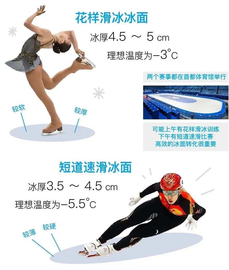 在冬奥赛事中,不同的运动项目对于冰面的要求不一样,由此会设计相应的制冰参数。比如花样滑冰的冰面厚度是在5.5厘米至6厘米之间,但短道速滑的冰面厚度在3.5厘米至4厘米之间。不难发现,花样滑冰的冰面更厚,这是因为花样滑冰运动员的比赛动作中会有起跳和落地的动作,落下来的时候冰刀会刻到冰面上。如果冰面太薄,就有可能刻在水泥地面,进而导致运动员受伤。而在冰壶比赛中,冰面仅仅1毫米的平坦度偏差,都会对冰壶的走向产生很大影响,进而影响选手的发挥。