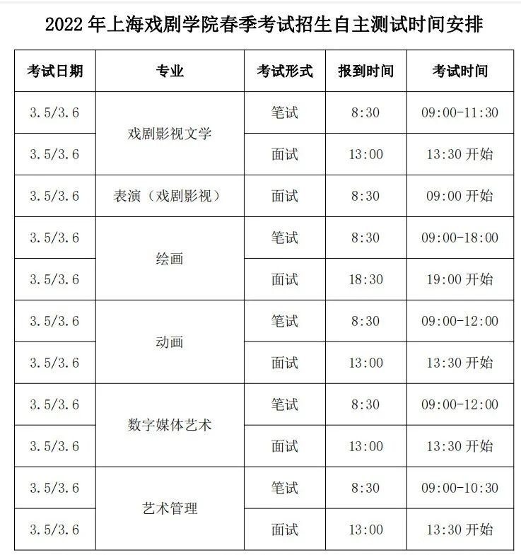 加入春招的六大专业,均设有院校自主测试。春考笔试达到上戏自主测试入围资格线的考生,包括表演(戏剧影视)专业资格考试的合格者,网上手续办理时须在各专业自主测试考试时间3月5日至6日之间,结合自身实际情况任选其中一日进行“校测”。自主测试满分为150分,考生若缺考相关专业自主测试,则相应测试成绩按0分计入春考总分,参与后续录取排序。