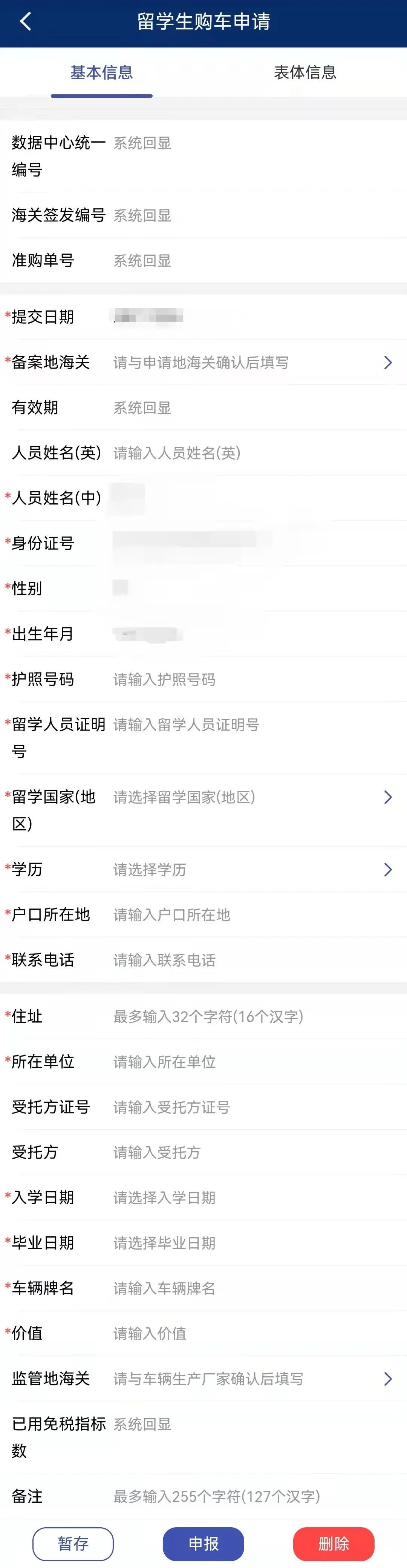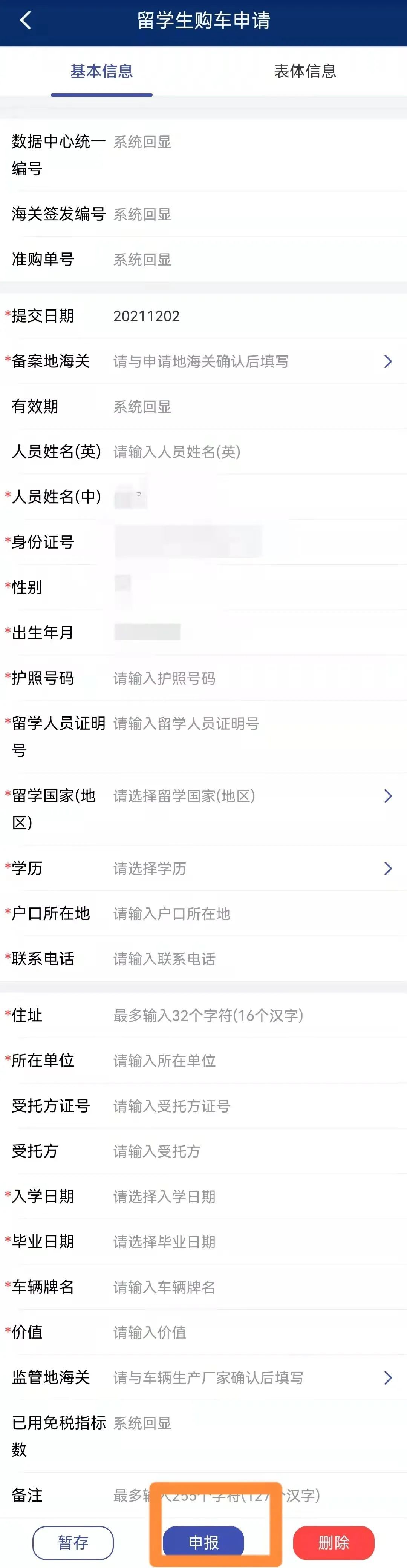填写留学生购车申请“基本信息”。