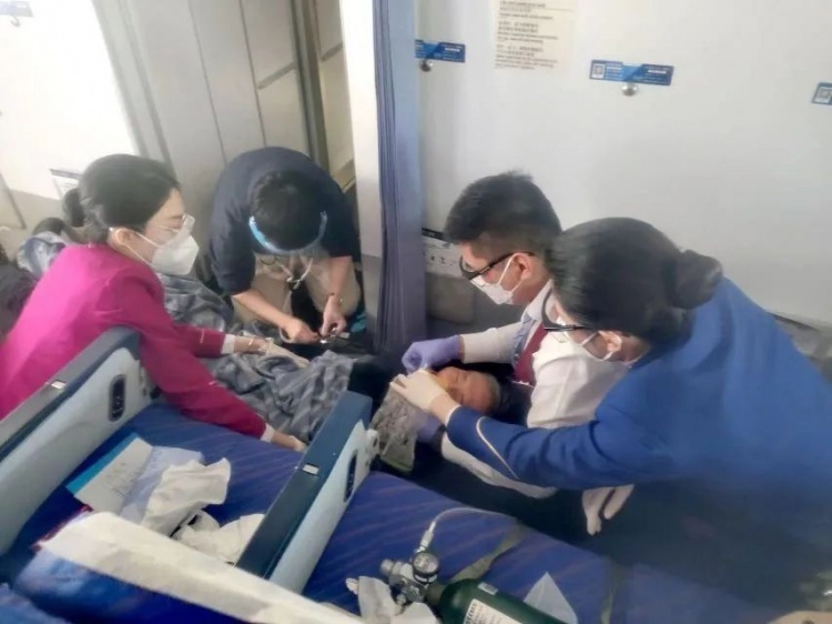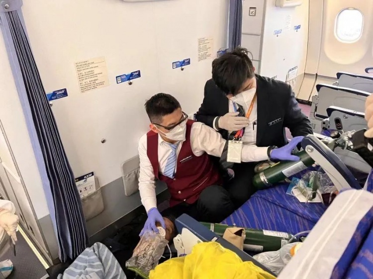 2月11日,南航cz3095(上海浦东-台北)航班上一位83岁高龄的轮椅旅客陈老先生不慎噎食,呼吸微弱,情况危急。客舱乘务员协助机上医生实施急救,机组迅速决策返航浦东机场,因救治及时,老人送至医院抢救后转危为安。