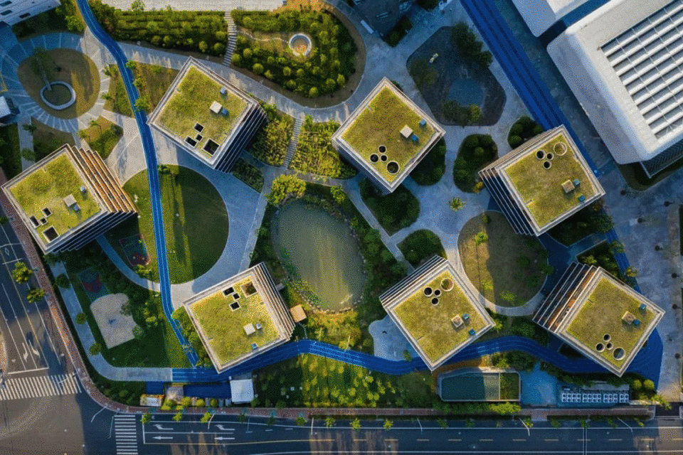 生活驿站作为“社会容器”把周围新住宅社区与浦南沿河公园围合成一个公共空间。从附近的高楼俯瞰,因为屋顶均种植了景天植物,乍一眼看过去,两栋建筑几乎与公园景观融为一体。