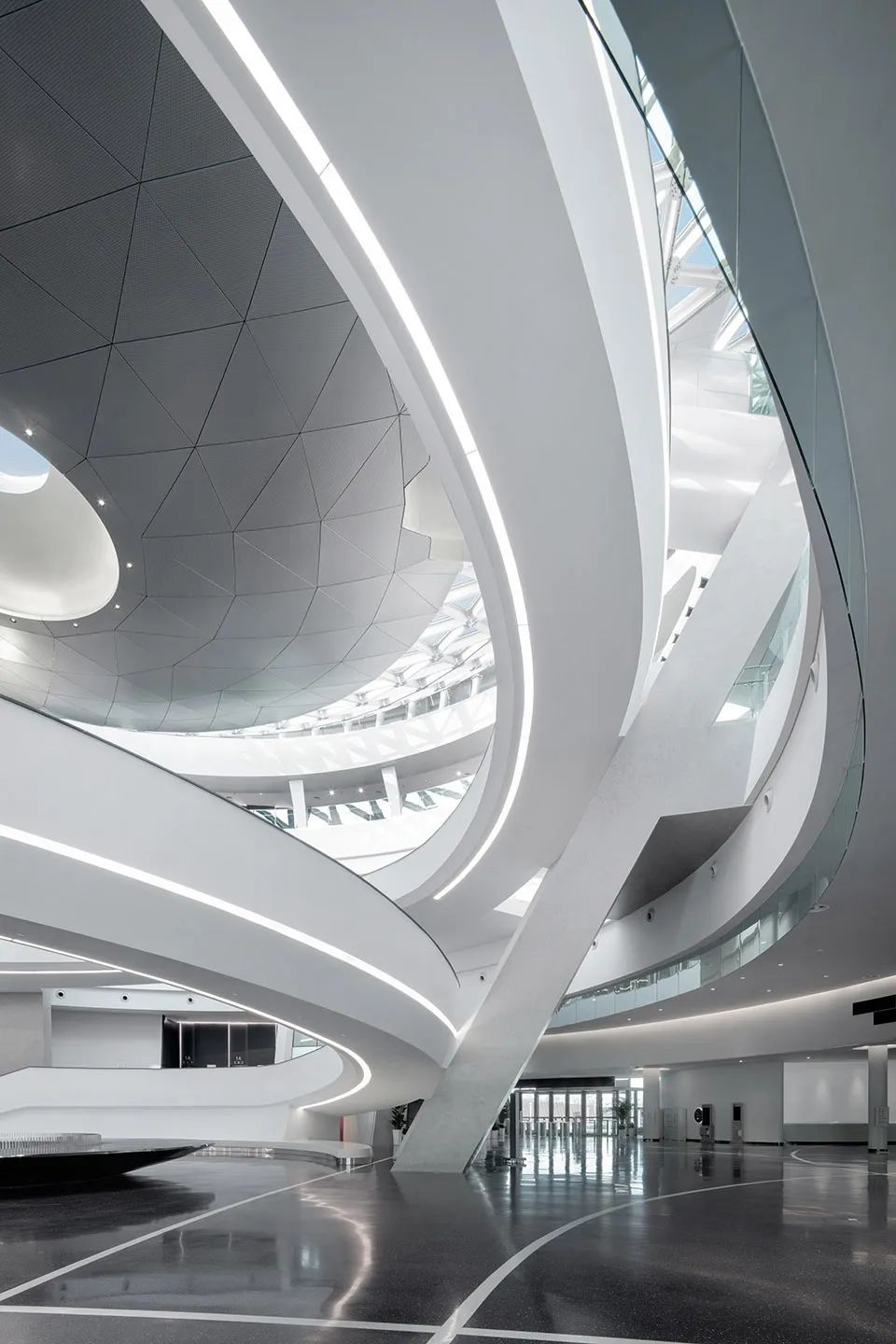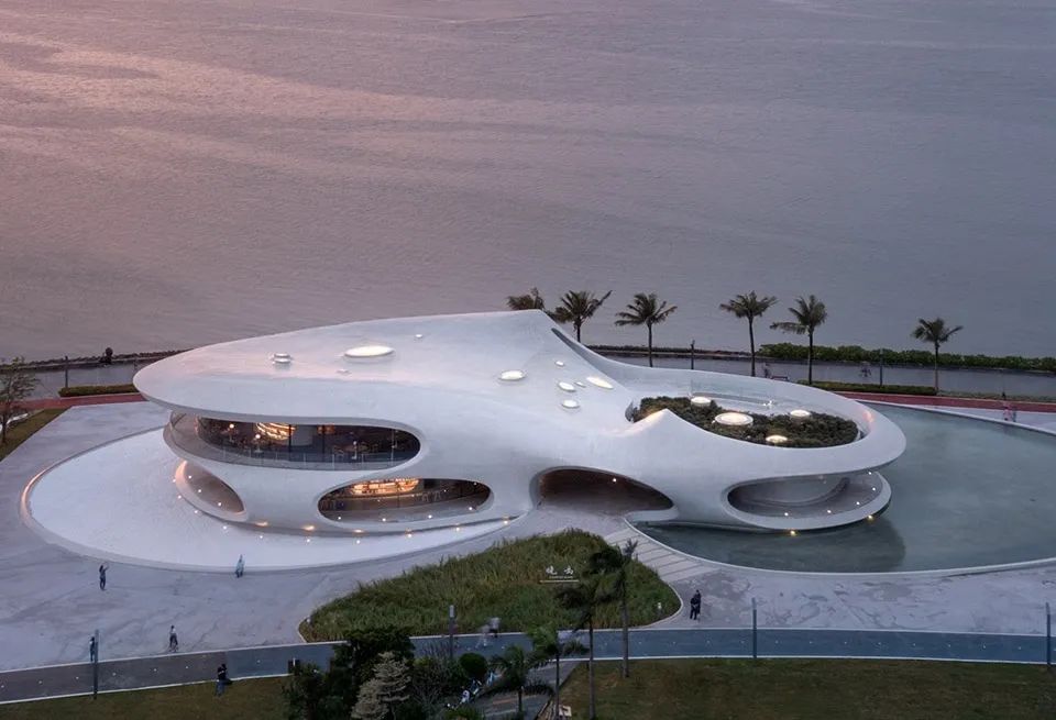 生活驿站采用白色多孔混凝土外墙,悬置于透明玻璃基座上,弯曲坡道景观延续至二层空间为公众提供俯瞰体验。未来会有展览区、健身房、青年活动区等多功能空间。