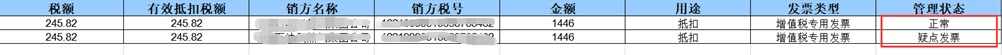 拖动至右边可查看发票类型、管理状态。管理状态为“疑点发票”的发票,企业勾选该类发票后系统将进行相应提示,请谨慎勾选,如图所示。