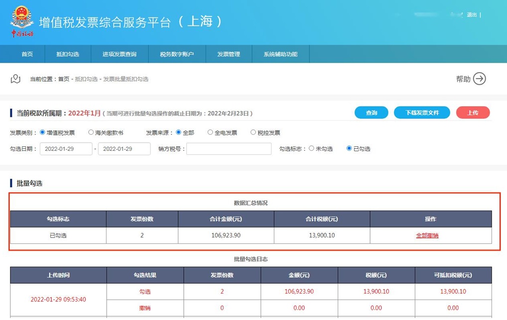 (2)数据汇总情况表格里看到符合筛选条件的已勾选发票汇总信息;