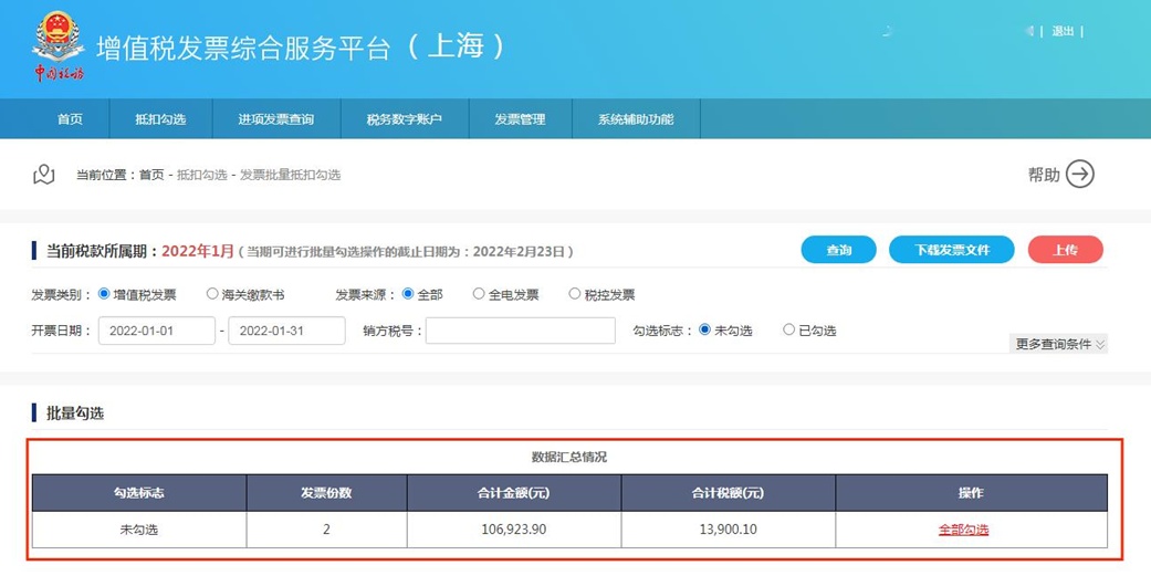 (2)数据汇总情况表格里看到符合筛选条件的未勾选发票汇总信息;