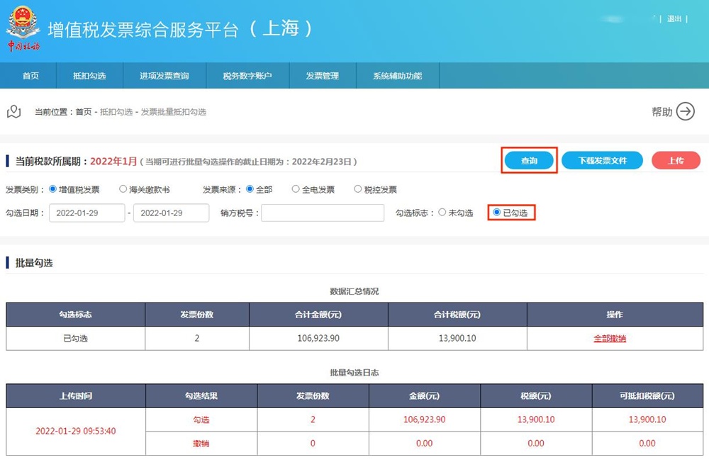 (1)勾选状态选择“已勾选”,在查询条件区,选择勾选日期的范围,点击“查询”按钮,可查询当前税款所属期已勾选的发票;