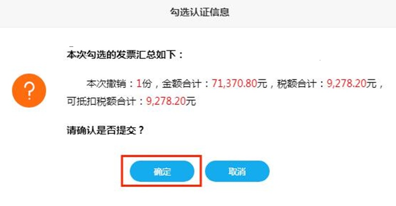 (2)确认本次需要勾选的发票全部勾选完成后,点击“提交”按钮,弹出勾选认证信息对话框如下: