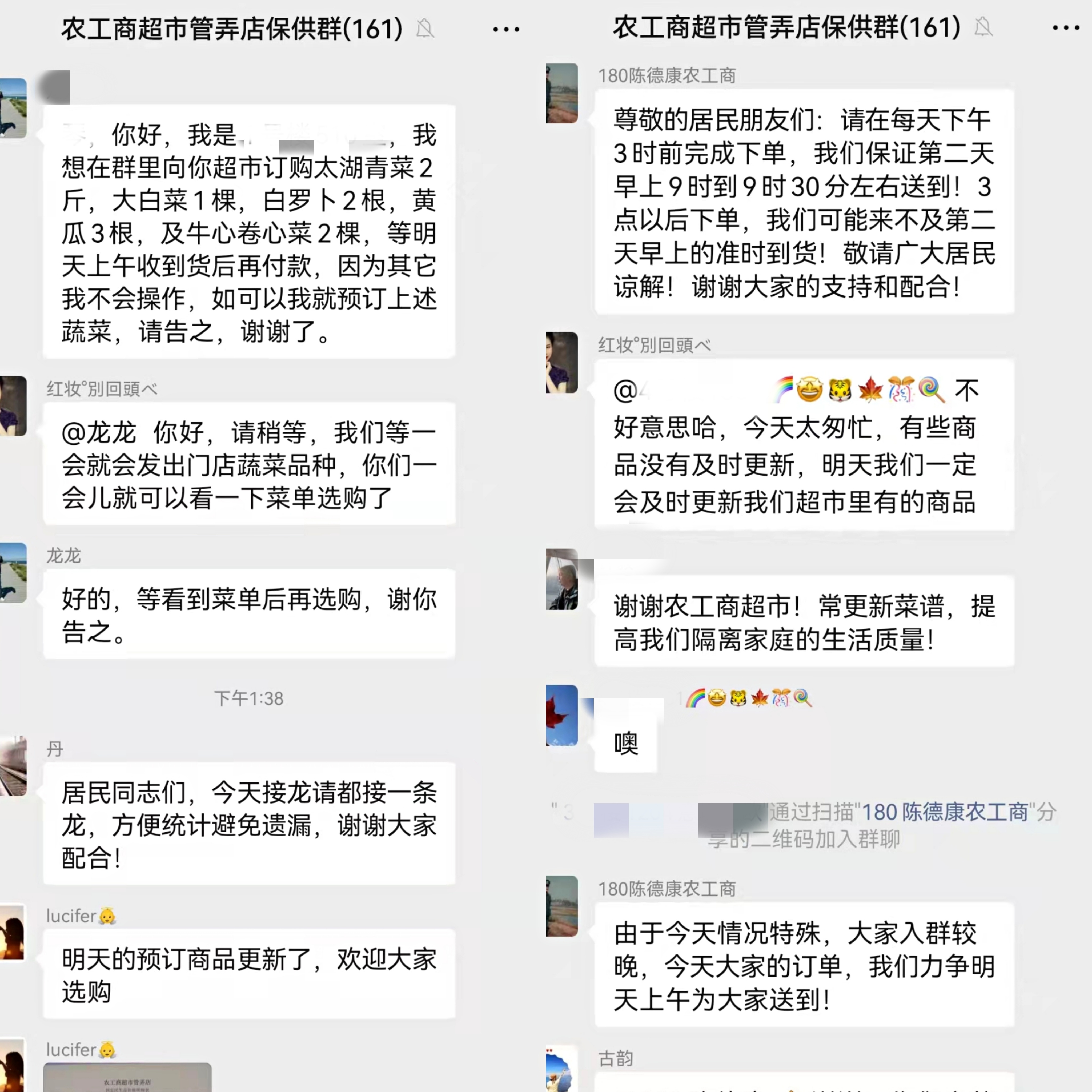“我想订太湖青菜2斤,白萝卜2根,黄瓜3根……”下午1时30分,“农工商超市管弄店保供群”里开始接龙。最高峰时,一天下了55单。