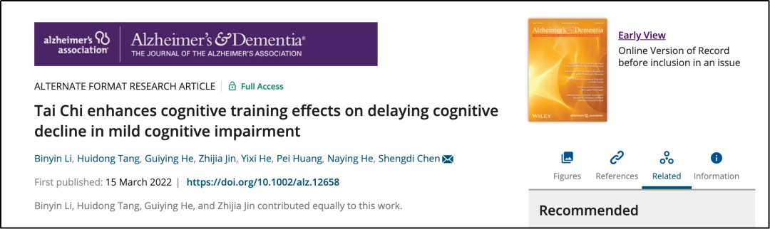 3月15日,瑞金医院神经内科陈生弟教授团队关于太极-认知联合训练干预轻度认知障碍(mci)的研究成果,在痴呆研究领域最具影响力的权威医学杂志——alzheimer’s & dementia上发表。