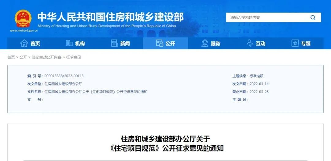 根据住房和城乡建设部工程建设标准编制工作计划,《住宅项目规范》已起草完成,在前期多次征求意见基础上修改完善并经专家审查通过。现再次向社会公开征求意见。