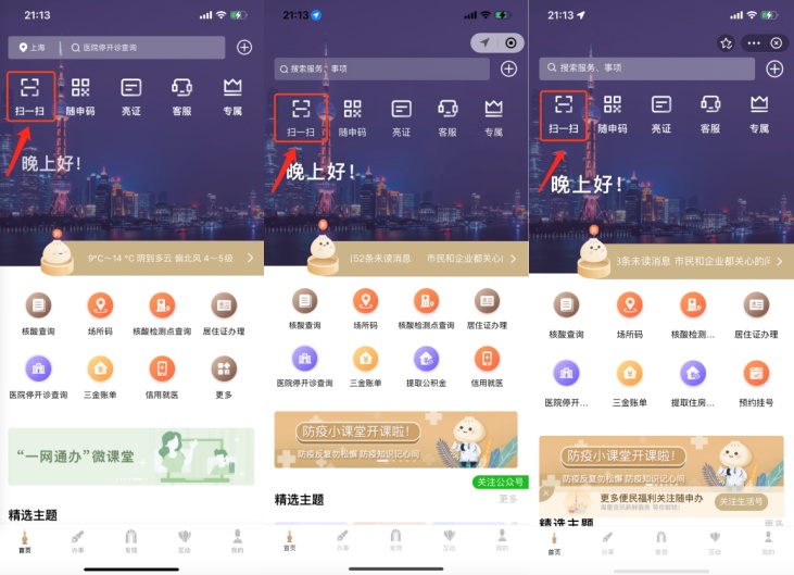 方法一:使用“随申办”微信小程序、“随申办”app和支付宝小程序的“扫一扫”功能