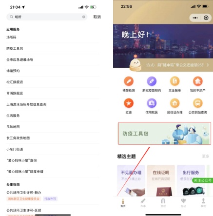 1、单位法人或授权经办人打开“随申办”微信小程序、“随申办”app和支付宝小程序,搜索“场所码”或打开首页“防疫工具包”,进入后点击“场所码”。