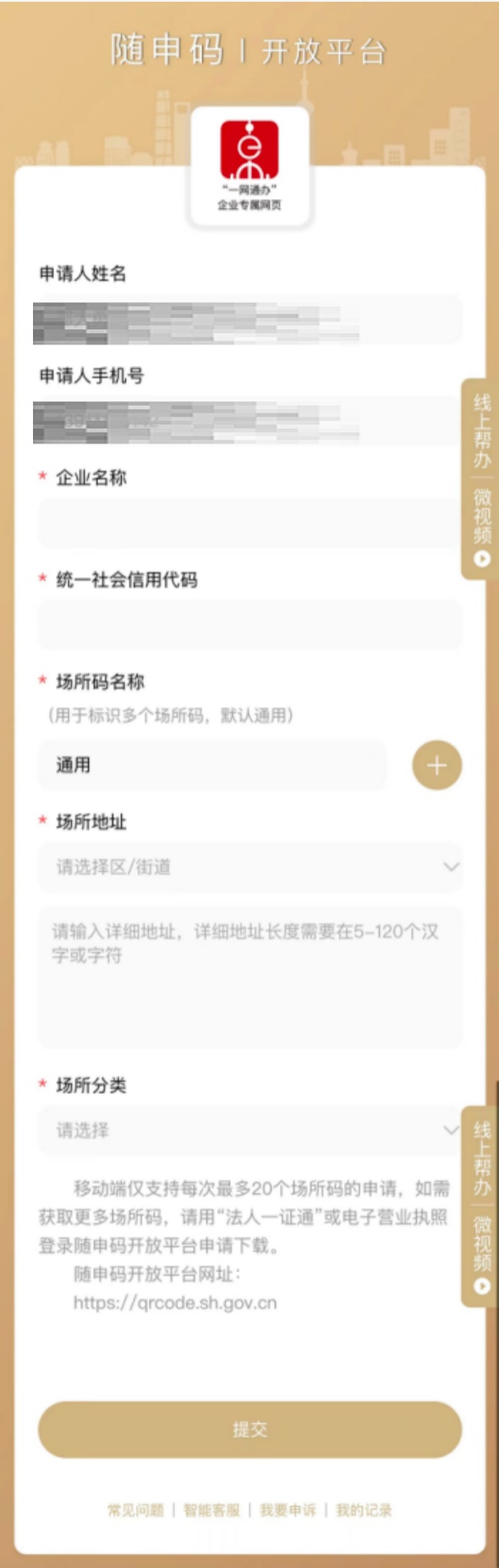 2、进入“场所码”申请页面,填写相关信息确认无误后点击“提交”。