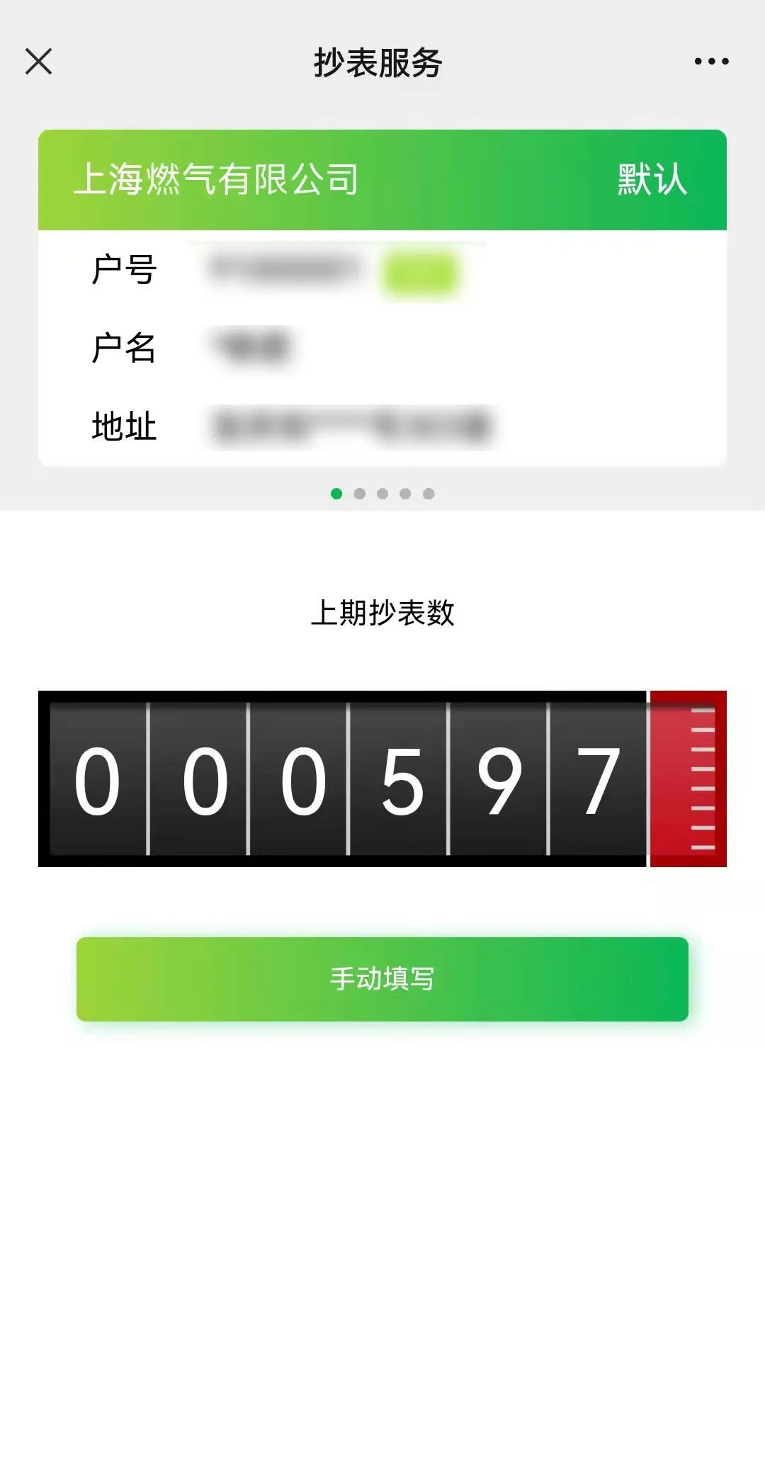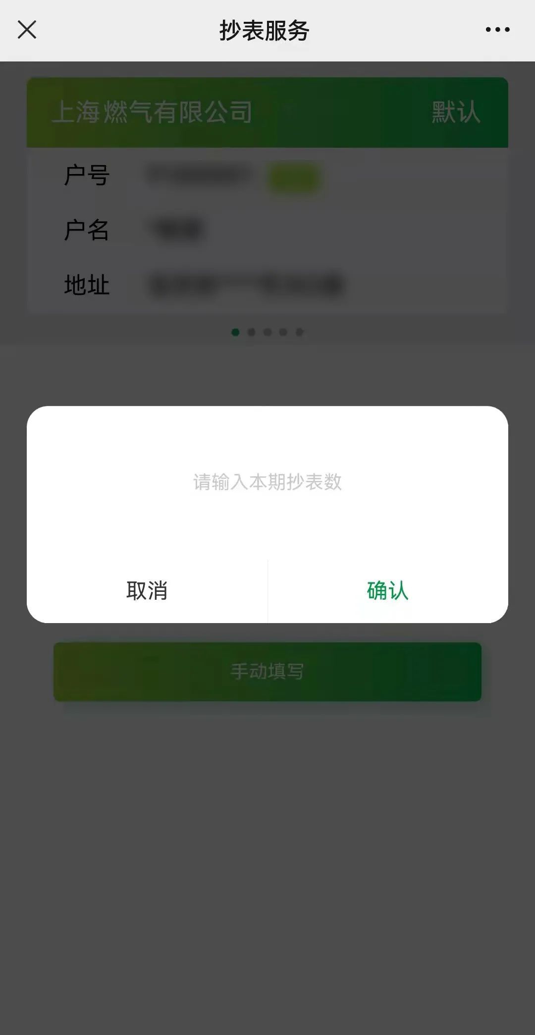 进入“上海燃气”微信公众号,点击“微客服”菜单/进入“微客服”首页,点击“自助抄表”/点击“手动填写”/输入数值,点击确认/提交完毕后,即为完成自助抄表