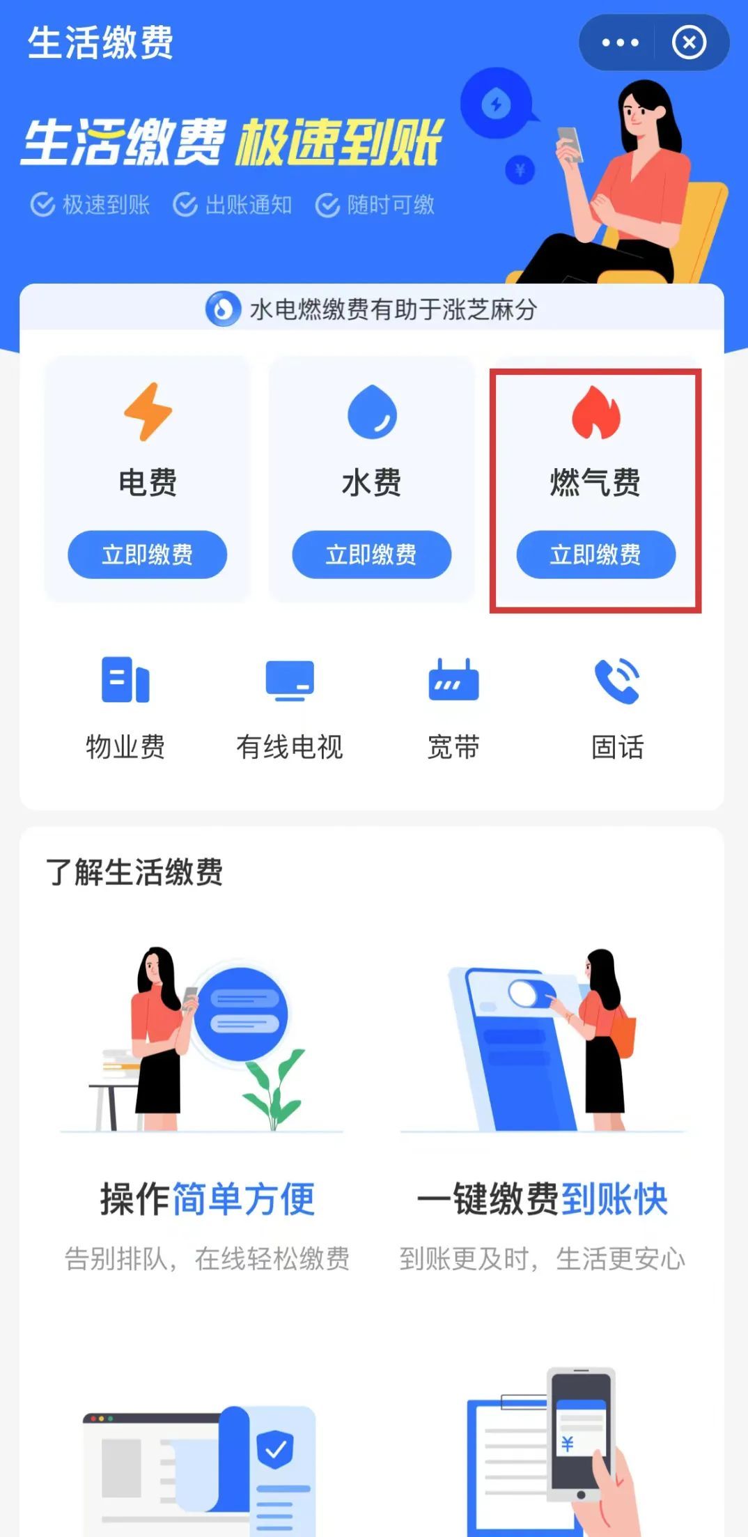 查询路径3:微信-生活缴费-去缴费-燃气费。