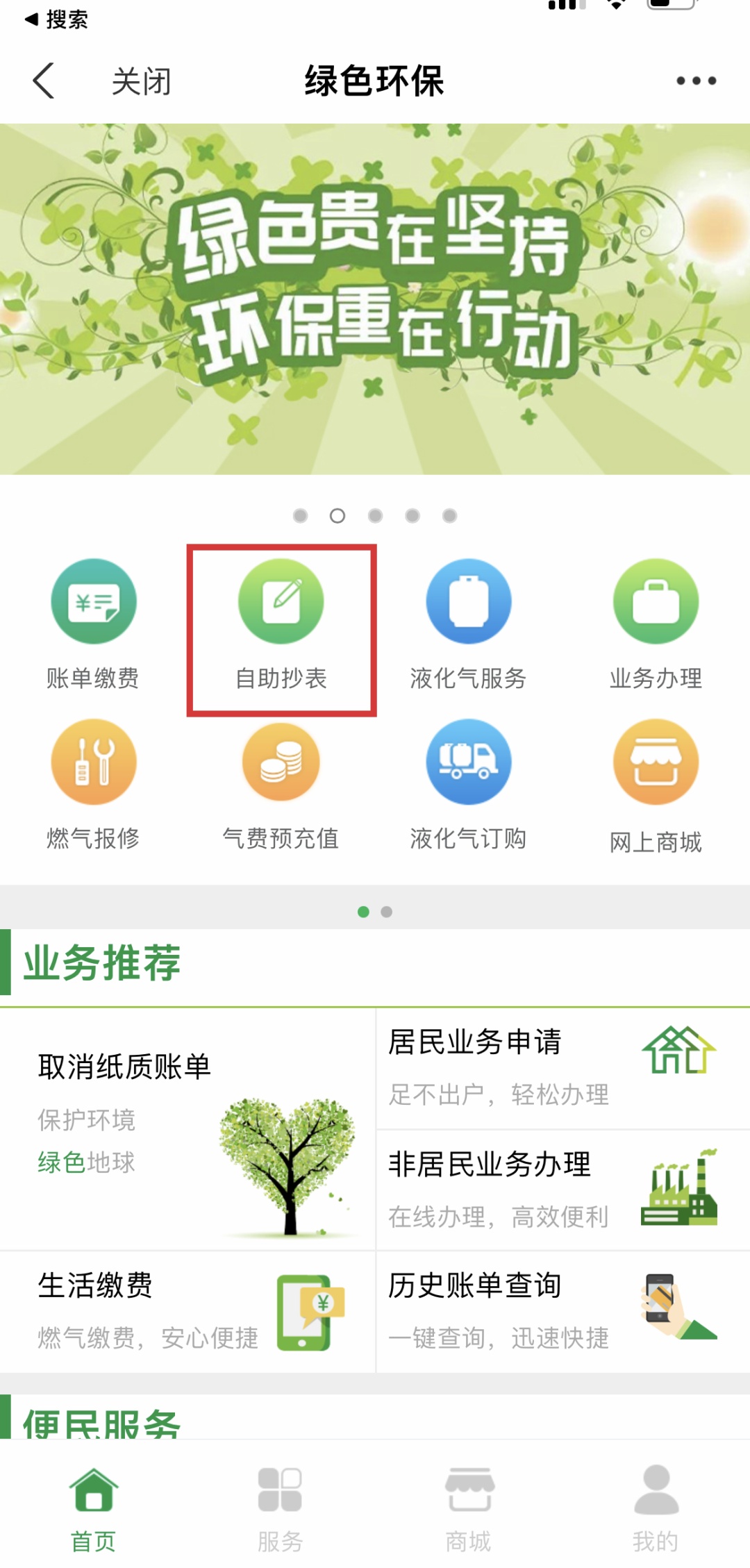 方法2:如果您没有收到推送信息,您可以直接登录上海燃气微客服平台,点击首页的“自助抄表”模块,按照信息提示逐步操作,点这里——