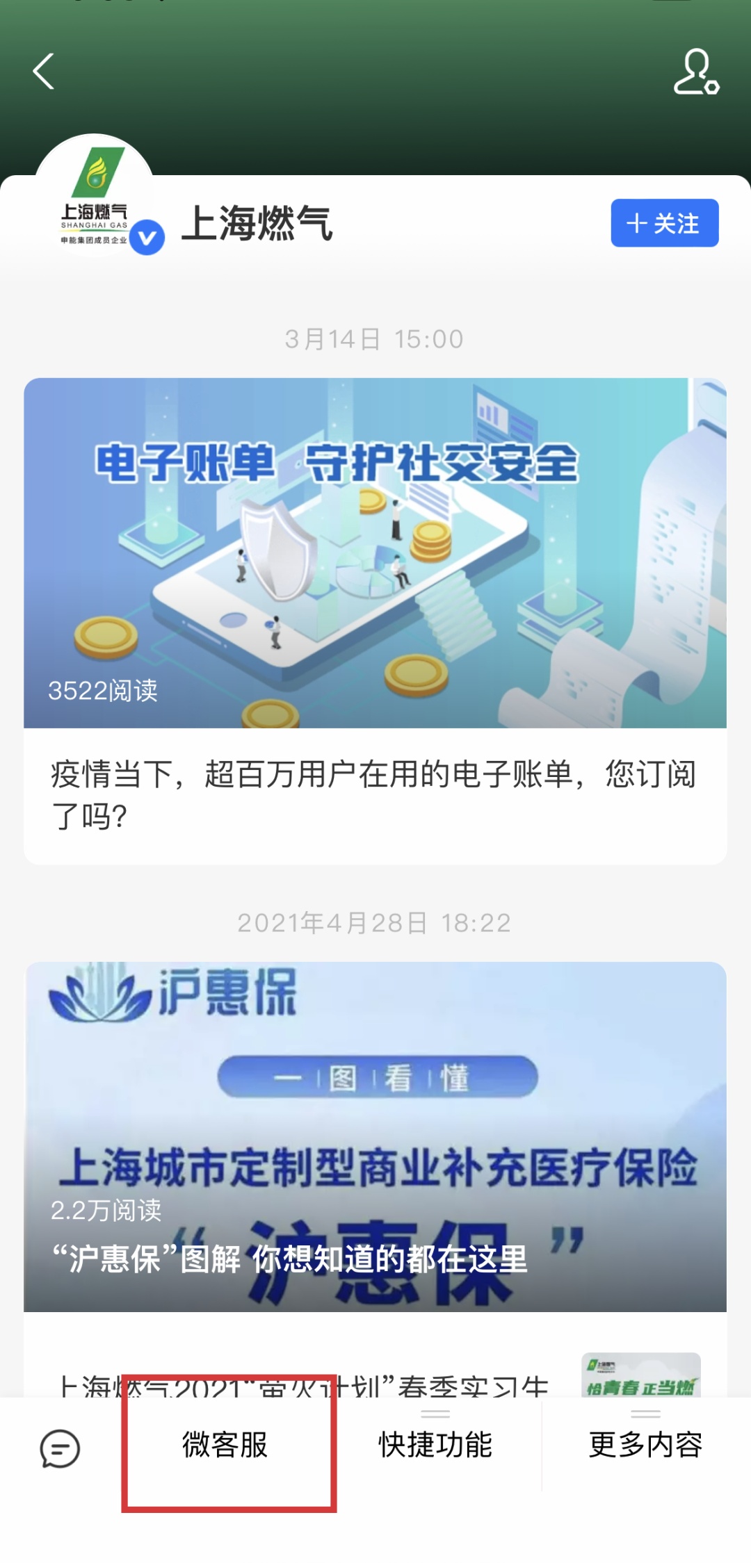 进入支付宝app首页,搜索框内输入“上海燃气”并搜索/进入“上海燃气”生活号/点击页面下方“微客服”菜单栏/进入微客服首页,点击“自助抄表”