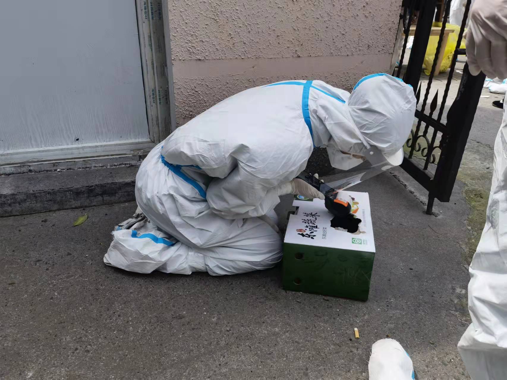 对于使用智能手机不便的老人,他们用通俗易懂的方式引导老人完成采样登记。户外光线太亮,他们就跪在地上借助一个开有一扇“小天窗”的纸盒,完成核酸登记二维码扫码工作。