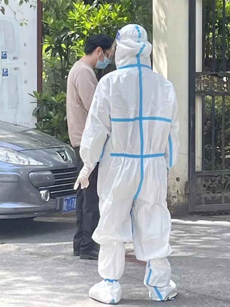 随后,居委的同志又给我加了一层透明塑料面罩,然后用胶带把我的袖口以及鞋套跟裤腿接头处一一绑好。