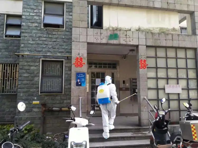 ▲工作人员穿着防护服在小区开展消毒杀菌工作