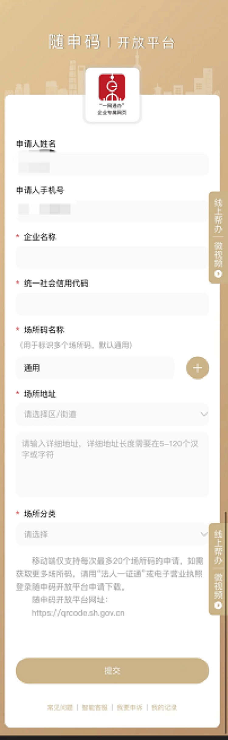 2、进入“场所码”申请页面,填写相关信息确认无误后点击“提交”。