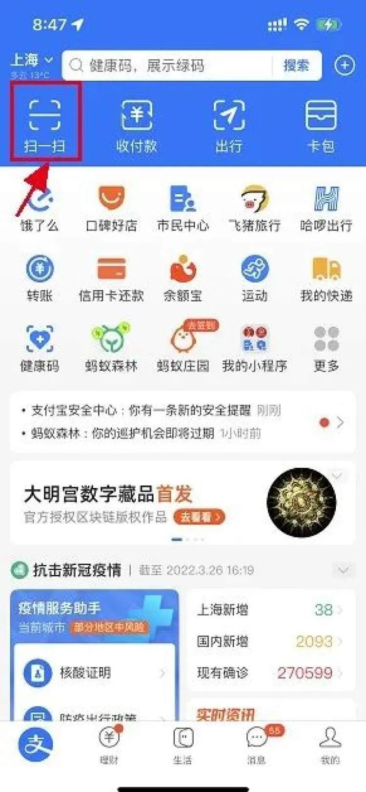 方法一:使用“随申办”微信小程序或“随申办”app、支付宝小程序的“扫一扫”功能。