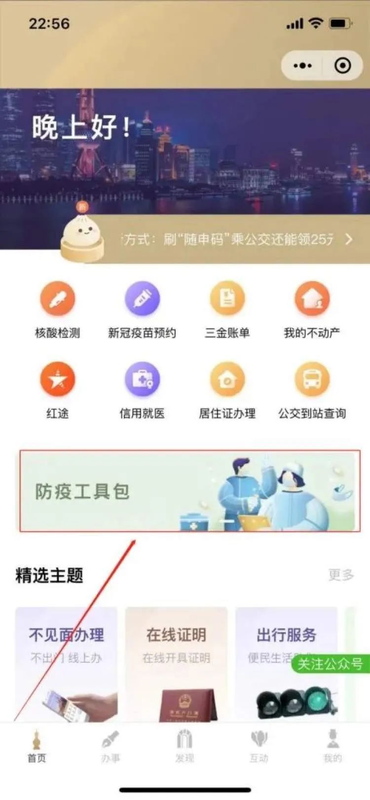 1、单位法人或授权经办人打开“随申办”app或“随申办”微信、支付宝的小程序,搜索“场所码”或打开首页“防疫工具包”,进入后点击“场所码”。