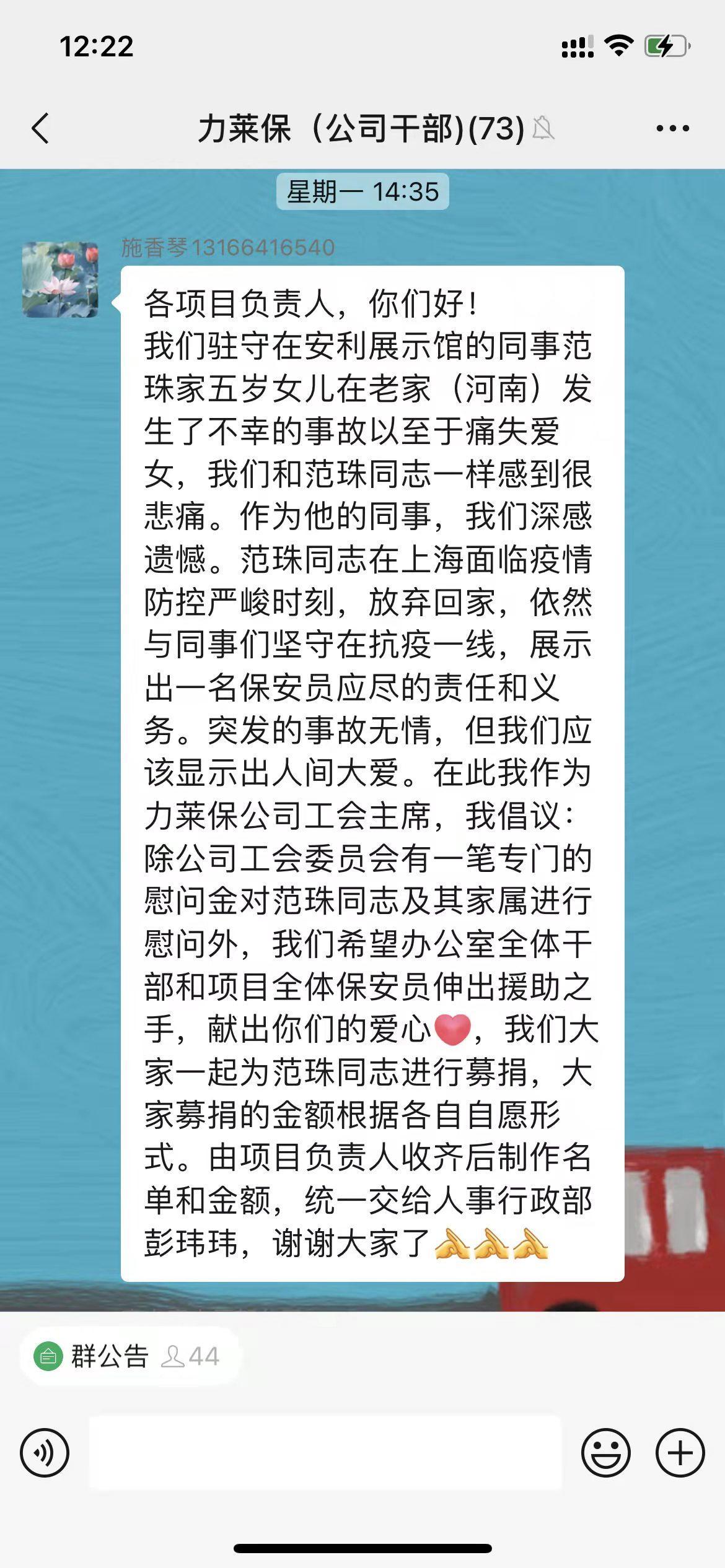 然而,那种“痛”是揪心的痛,撕心裂肺的痛,他却强忍着悲痛,藏在心里,想等到上海疫情控制后,再回河南老家为自己的宝贝女儿办理后事。突发的事故无情,但人间有爱。不久之后,他的队长万元了解情况之后,一边安抚他,一边号召本项目全体保安队员和保洁员,大家发起了募捐献爱心的行动。