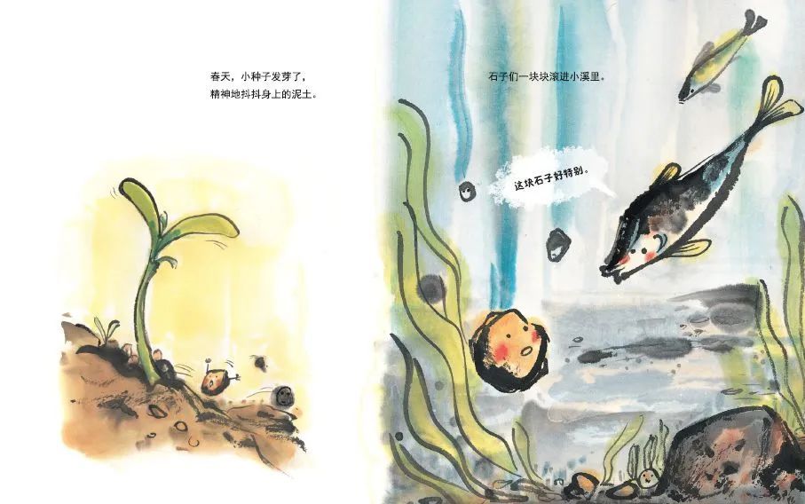 春天,小种子发芽了,精神地抖抖身上的泥土。石子们一块块滚进小溪里。