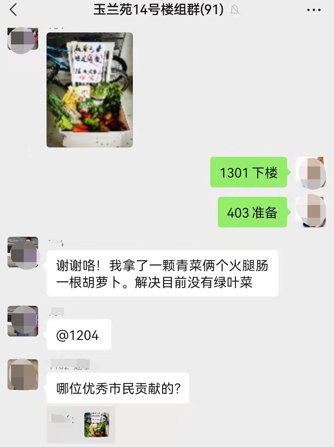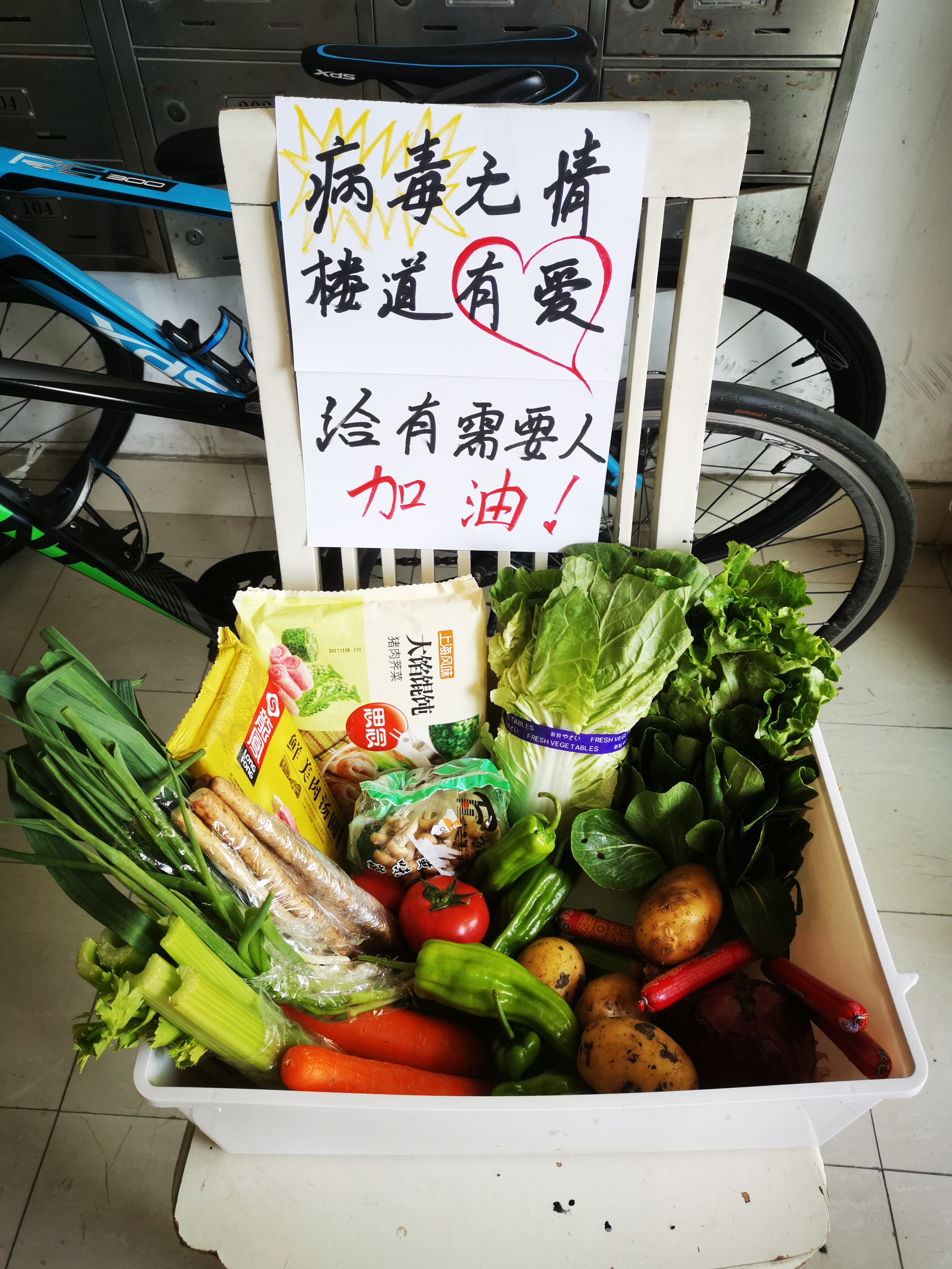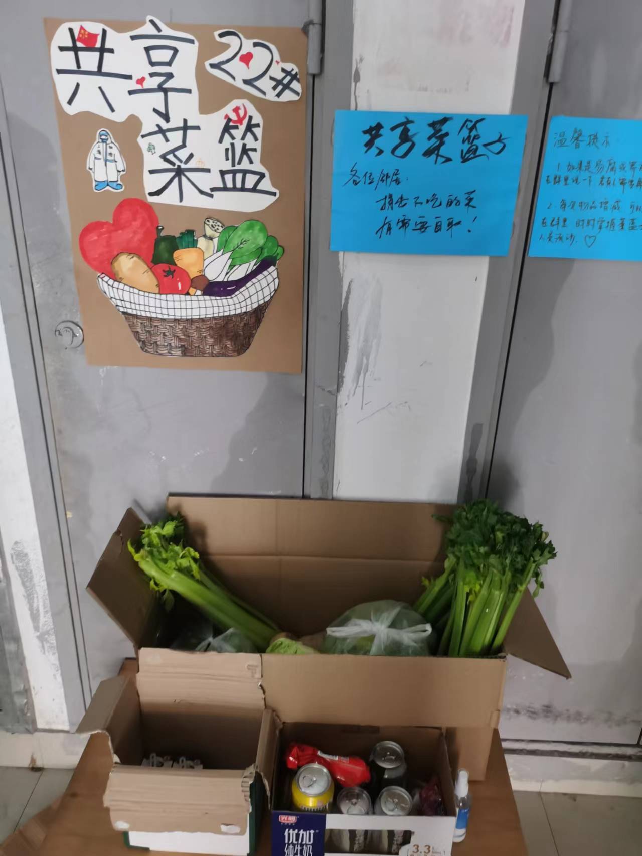 原来,住在12层的居民刘媛得知邻居们物资紧张,就把自己准备的一些蔬菜拿了出来。“封控前我和朋友跑了几家超市,准备了很多食物。我们平时吃得也不多,所以就分出一些给更需要的人。”刘媛说。