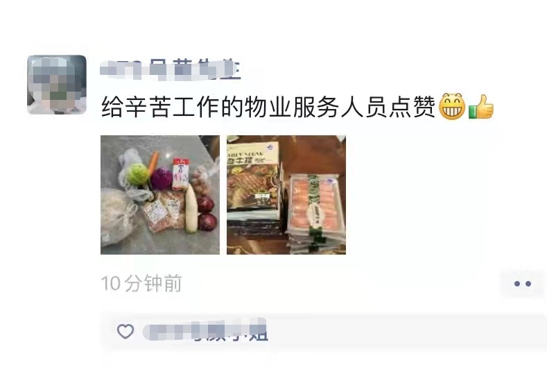 一些食物和生活用品日前出现在泗泾镇玉兰苑的楼道里,并配上了“可供自取、给有需要的人”的提醒,在洞泾镇长泰西郊小区,物业工作人员频繁收到礼物,那些礼物同样来自于他们特别的“家人们”。特殊时期,物资紧缺,但邻里情却在人们心间涌动。