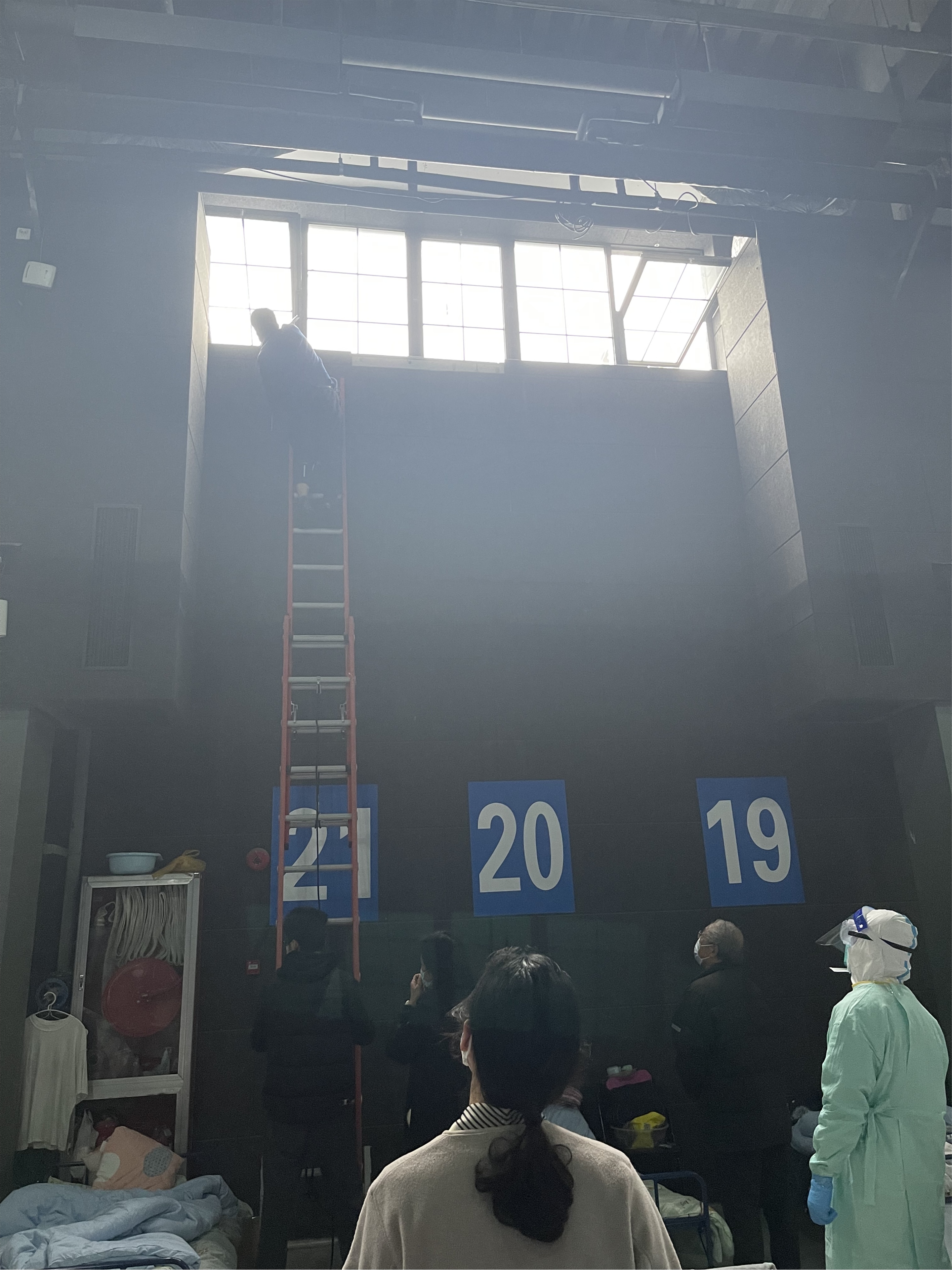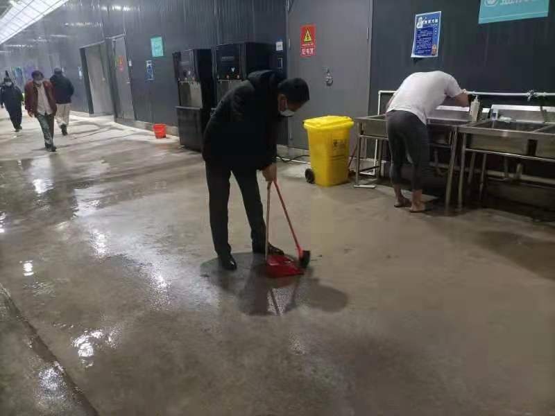 在电竞馆集中隔离救治点的过道里有部分积水路段,为防止地面湿滑造成安全隐患,现场公安负责人朱赓马上组织舱内的安保人员和志愿者进行清扫,并轮流进行巡逻,确保积水对舱内患者不会造成影响;天宴馆集中隔离救治点是由旧仓库改建而成,夹杂着西北风的暴雨从高高的窗户中“溜”进来,现场医护人员努力在患者中“挖掘”各行各业的能人,患者中的消防员在大家的帮助下,熟练而又矫健地上梯调整开窗的角度,把密密的雨水阻隔在窗外,让隔离点又恢复了阵阵暖意。