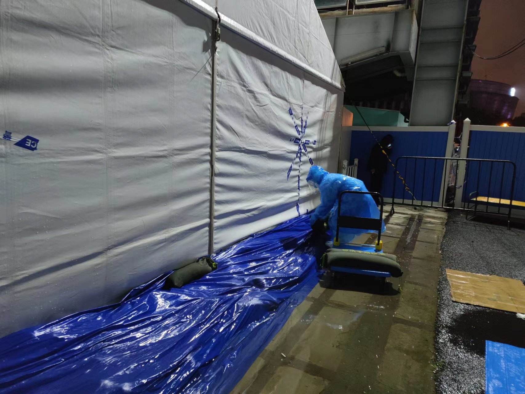 船舶馆集中隔离救治点因为地势比较低,非常容易造成积水,隔离点公安负责人周嘉敏提前调配防汛沙袋,现场组织指挥,公安、安保、医护、保洁和志愿者内外联动,齐心合力搬沙袋加固,并安排人员24小时值守,密切关注着方舱的变化。