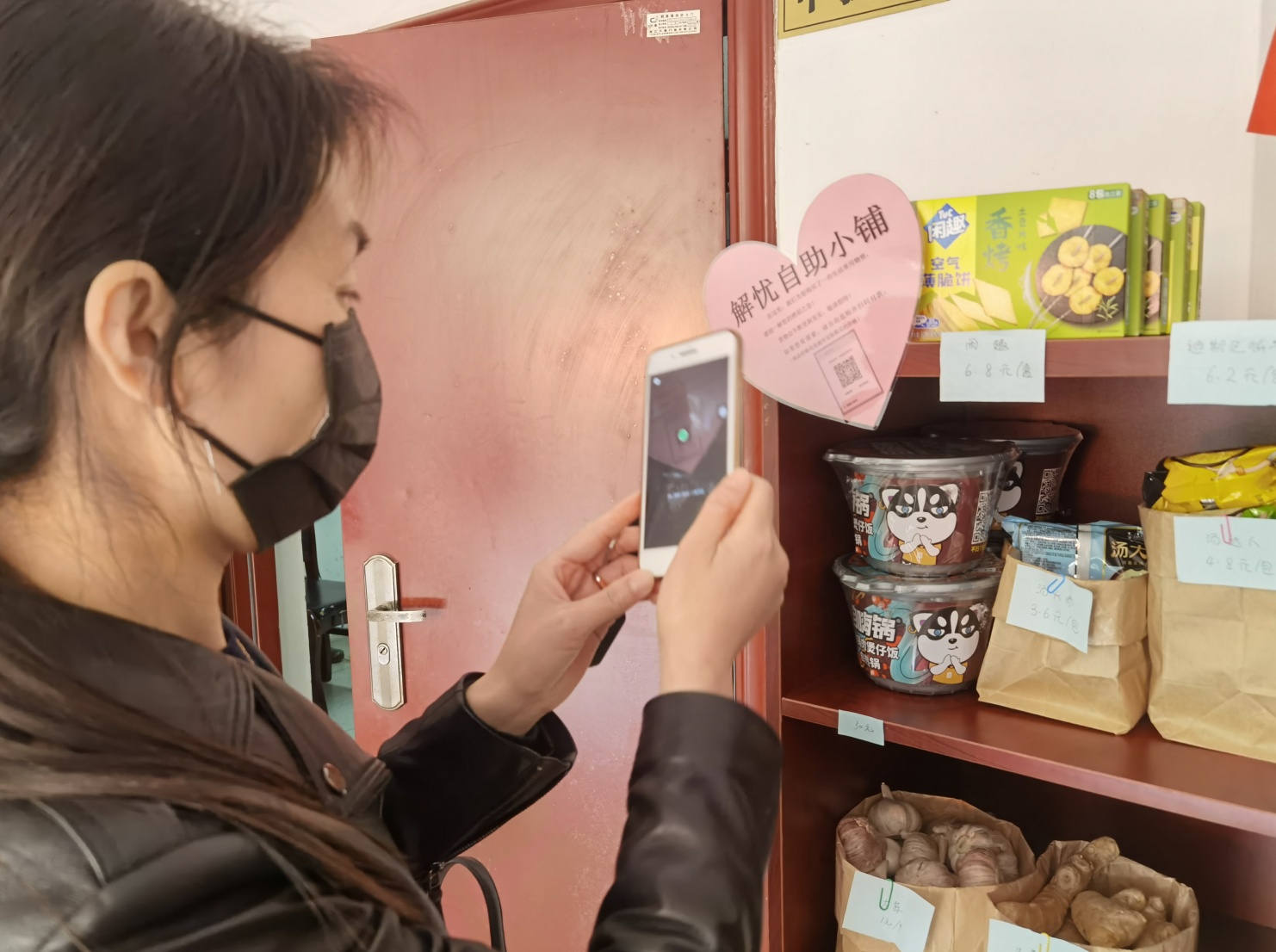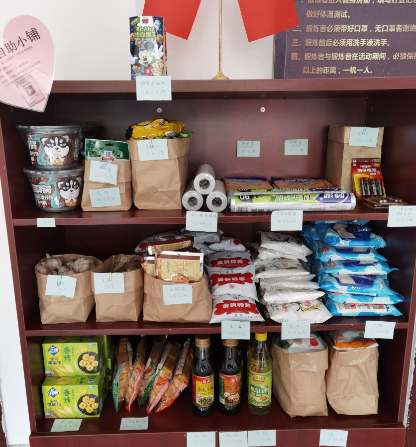 记者在现场看到,这个小铺很简朴,其实就是一个书柜。书柜分三排摆放着厨房调味类、食品类、生活用品类等物品,上面还用便签纸标明了名称及价格,旁边还贴心附上了购买方法与收款码。