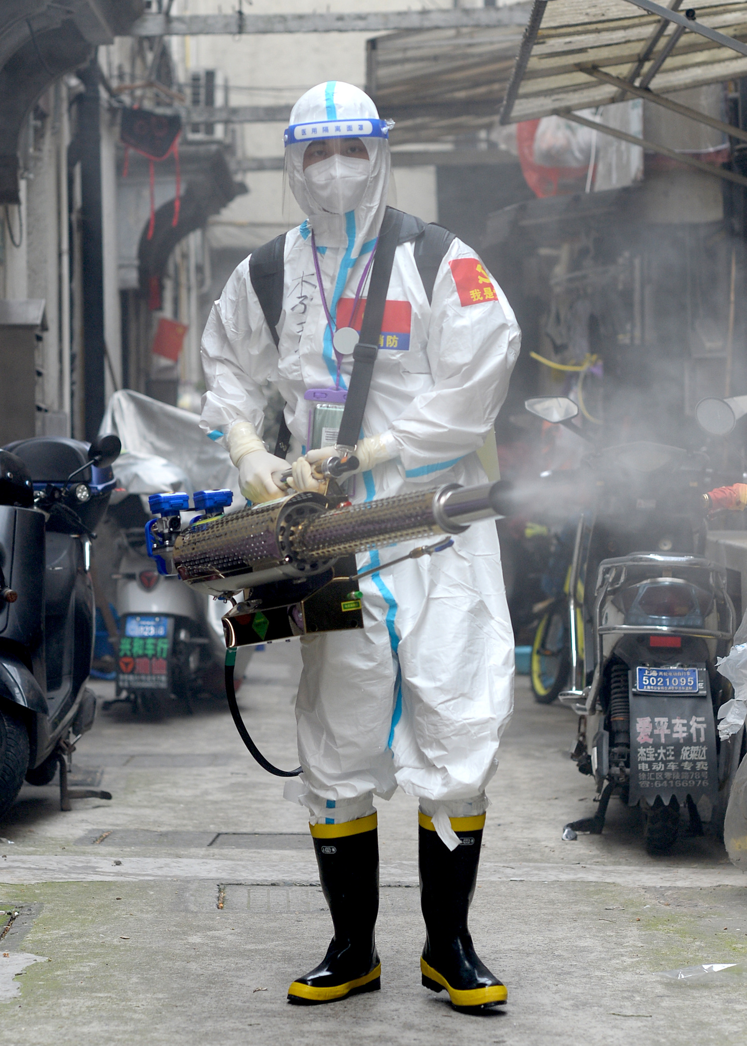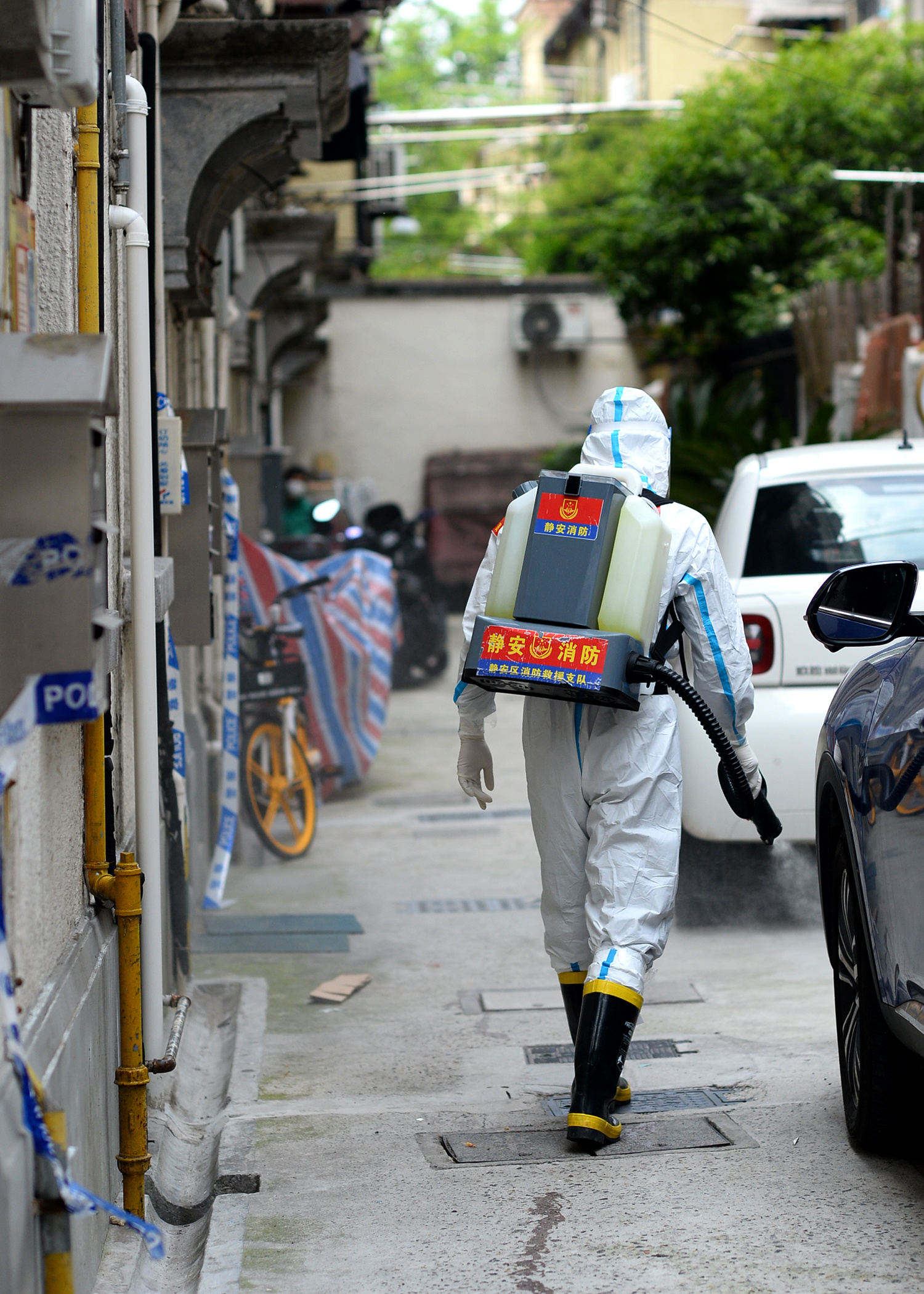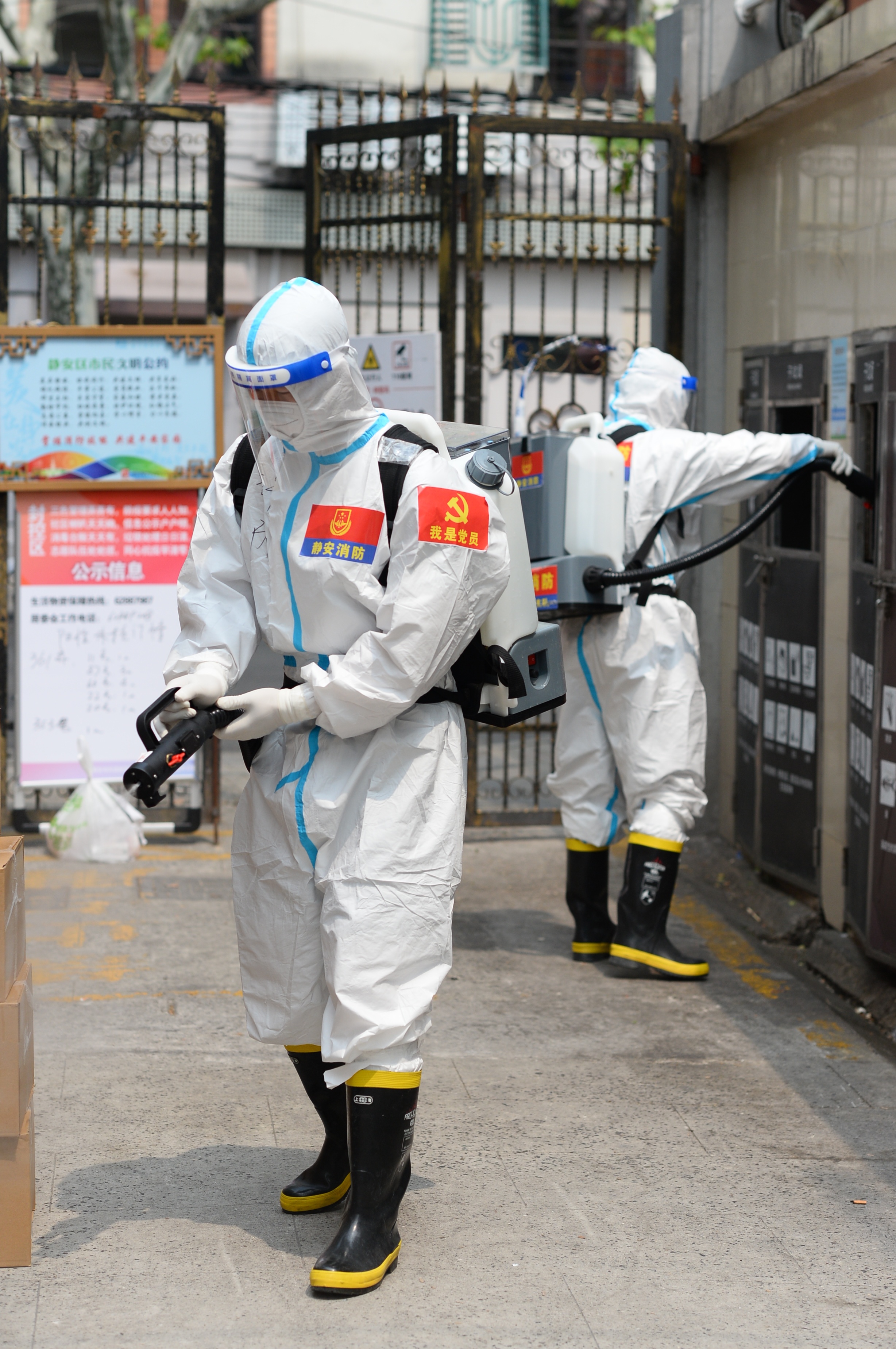 “再检查下防护,确保安全。”上午,在集合整队、开展消杀任务之前,静安消防党员涉疫勤务分队牛世强再次对队员作提醒。在愚园路上一老式小区,消防员到场后很快做好准备,迅速行动,在公共通道、楼道口、垃圾厢房、货物架等处开展消杀任务。