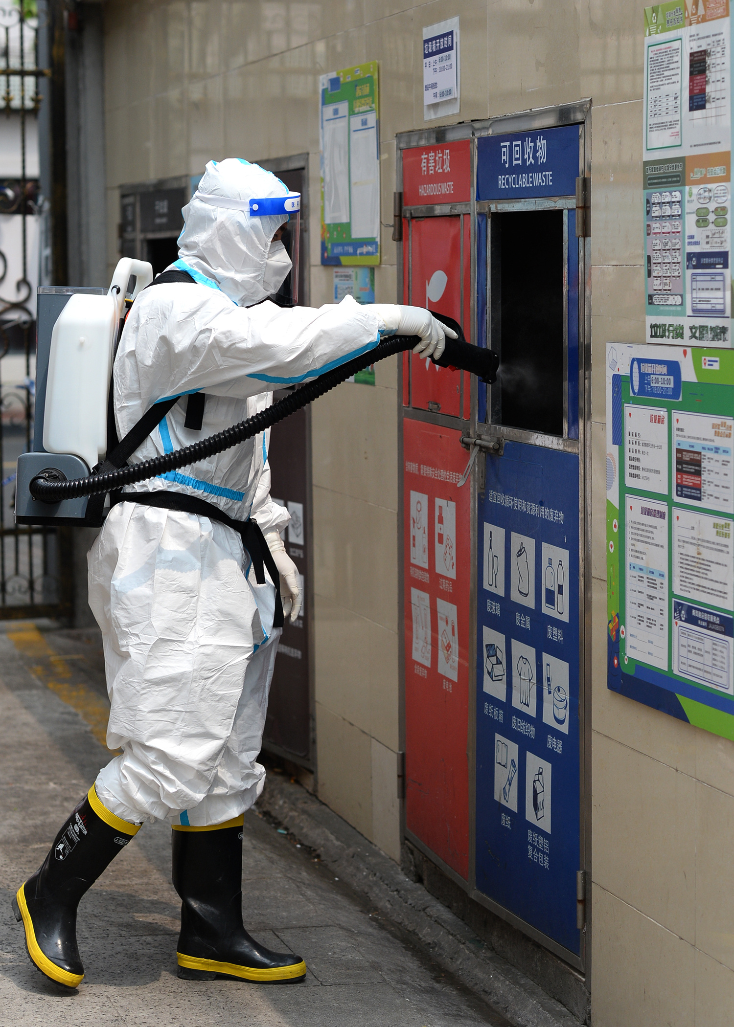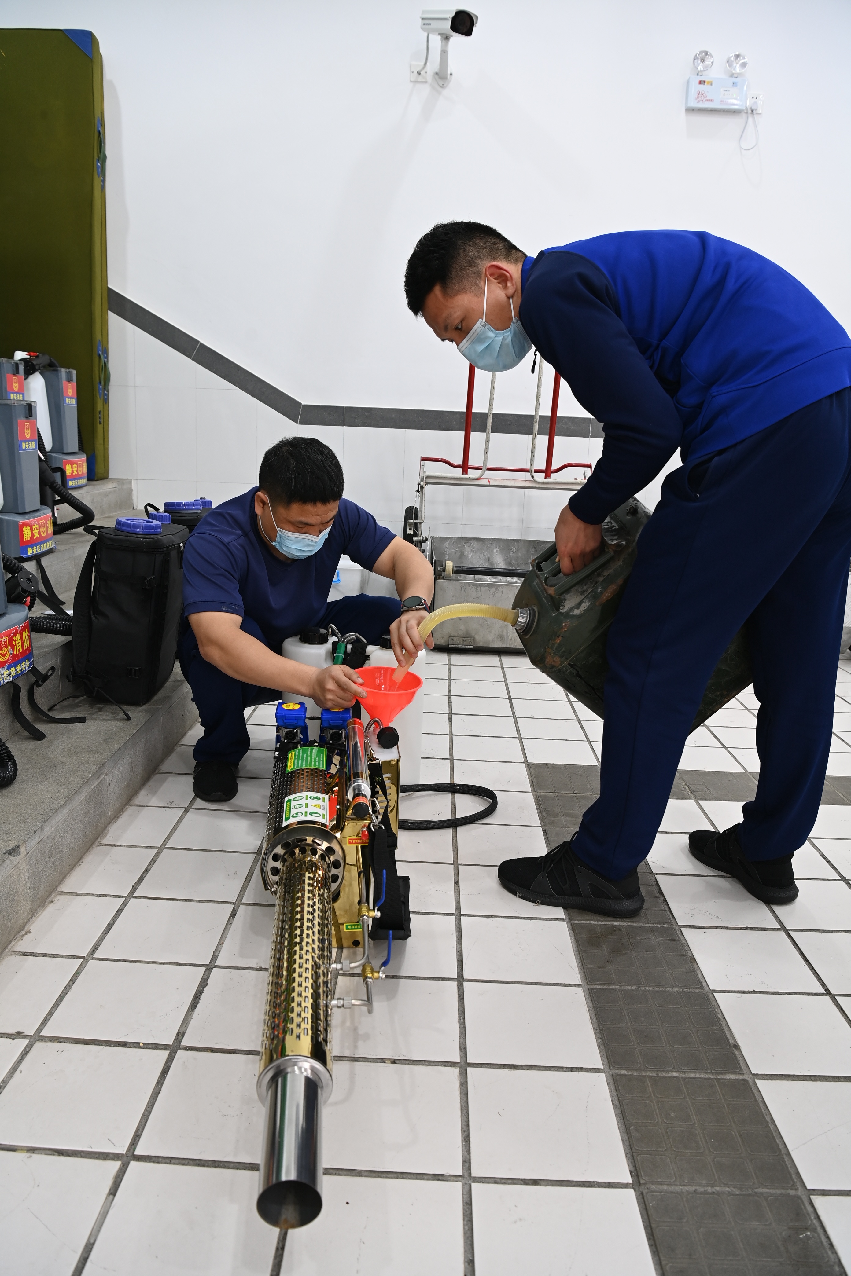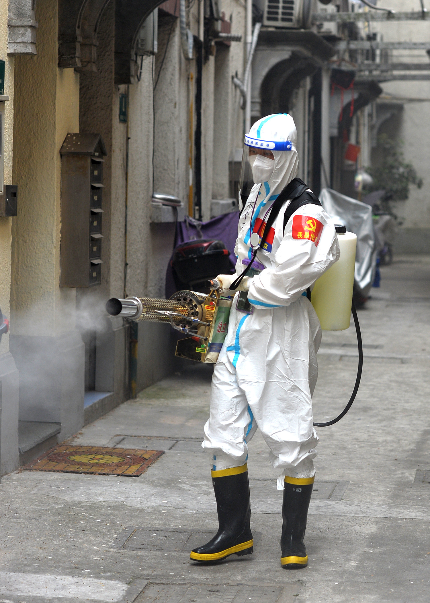 “再检查下防护,确保安全。”上午,在集合整队、开展消杀任务之前,静安消防党员涉疫勤务分队牛世强再次对队员作提醒。在愚园路上一老式小区,消防员到场后很快做好准备,迅速行动,在公共通道、楼道口、垃圾厢房、货物架等处开展消杀任务。