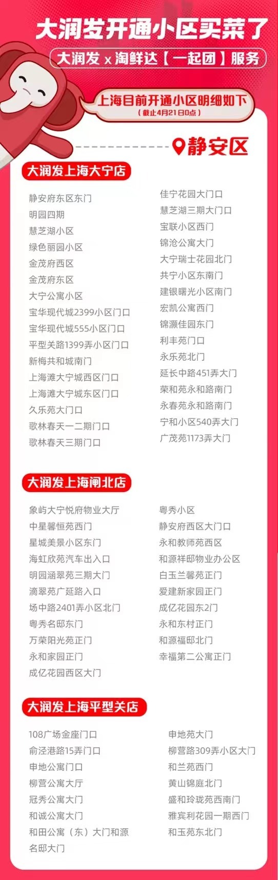 日前,记者从大润发获悉,大润发联合淘鲜达推出了线上下单、统一配送到社区的“一起团”团购服务。越来越多的大润发门店周边小区正在加入“一起团”,目前静安区已经开通的小区如下: