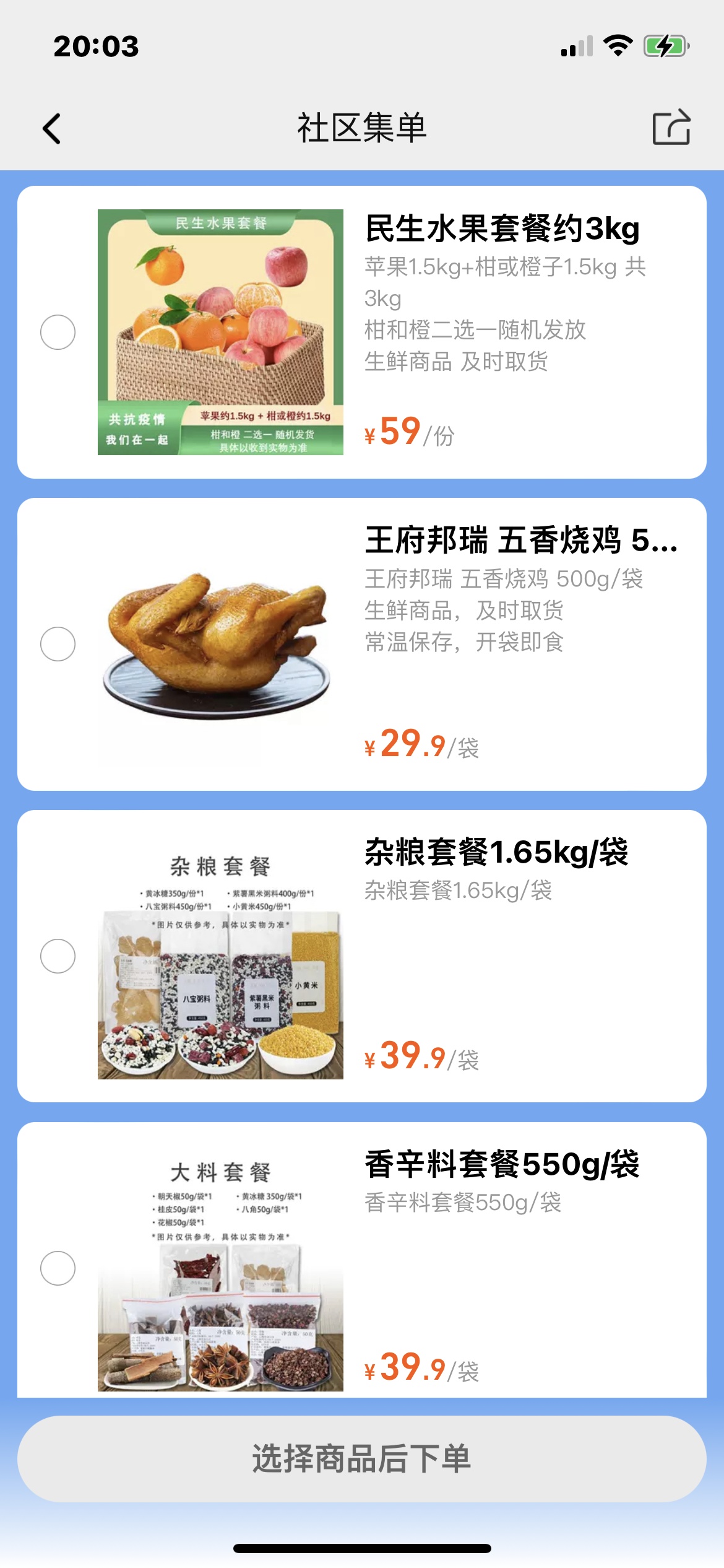 记者在淘宝app上看到,大润发推出的几款团购套餐售价在49元至69元之间,包括蔬菜套餐、水果套餐以及肉类、海鲜、半成品套餐,品种相对齐全。每日12点更新线上保供商品,根据需求增加库存、更新保供商品套餐。当天12点前下单,次日18点前配送;当天12点后的订单,将在后天18点前配送。
