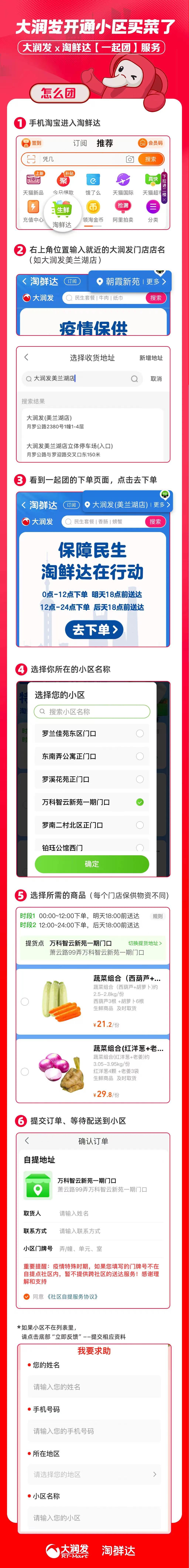据了解,处于“一起团”覆盖门店范围内的用户可以通过手机淘宝进入淘鲜达,找到对应门店进行下单,下单成功后,大润发将统一安排配送,货品到达自提点后,用户将收到短信提示,可以根据短信内容联系配送员或志愿者提货,也可到选择的社区指定位置自提。